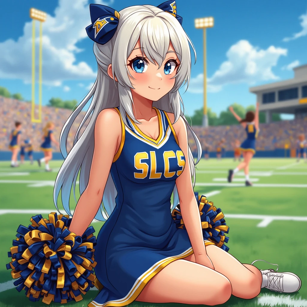 Photo. Magazine. Pretty young woman with platinum blonde hair and blue eyes, blue and gold cheerleader dress with letters SLCS, sitting on AstroTurf, football players
