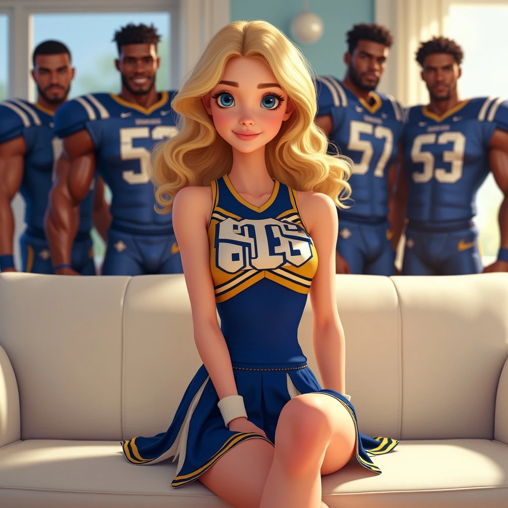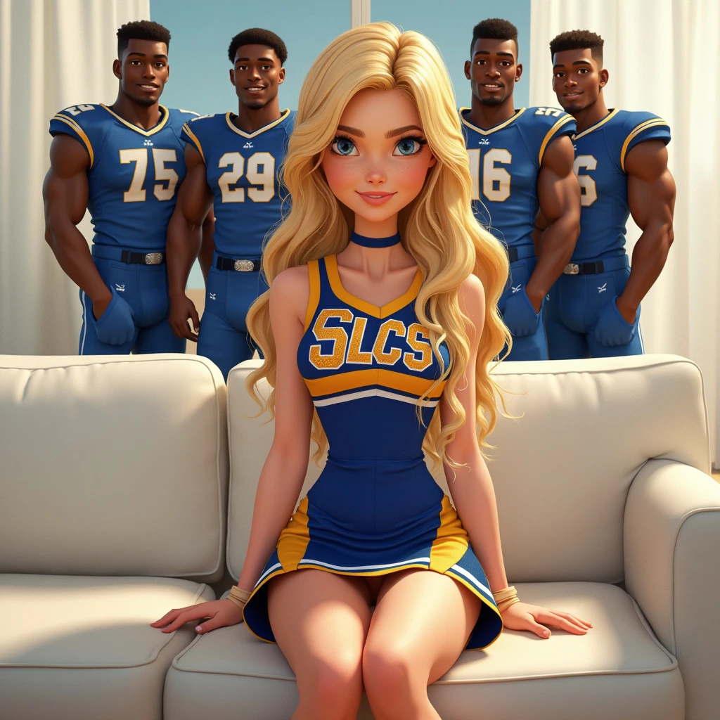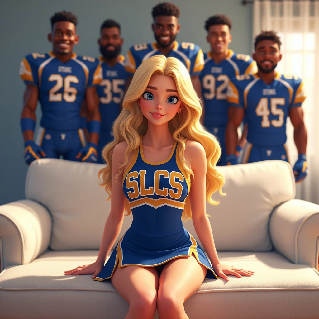 Disney Pixar 3d animated movie character, stunning young woman blonde wavy hair, blue eyes, cheerleader uniform dress blue and gold with the letters SLCS. Sitting on a white couch. Standing behind are 5 black football players with male football uniforms.