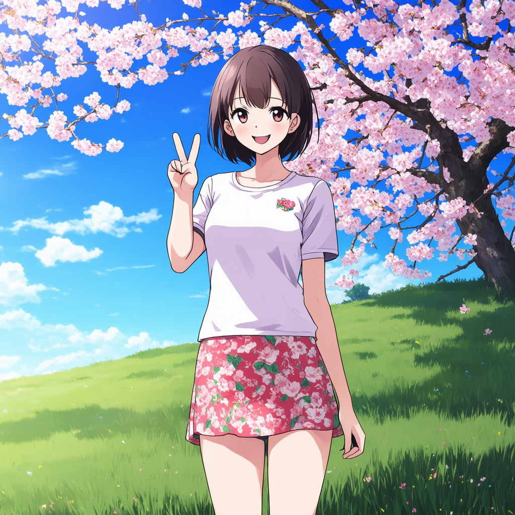 A charming and vibrant 2D anime screencap featuring a single girl with a bright smile, gazing directly at the viewer. She is outdoors, surrounded by a beautiful cherry blossom tree in full bloom. Holding a playful peace sign gesture, her outfit consists of a cute, short-sleeved top and a knee-length skirt with a floral pattern. The background is a serene and picturesque scene of the outdoors, with a clear blue sky and gentle breeze.