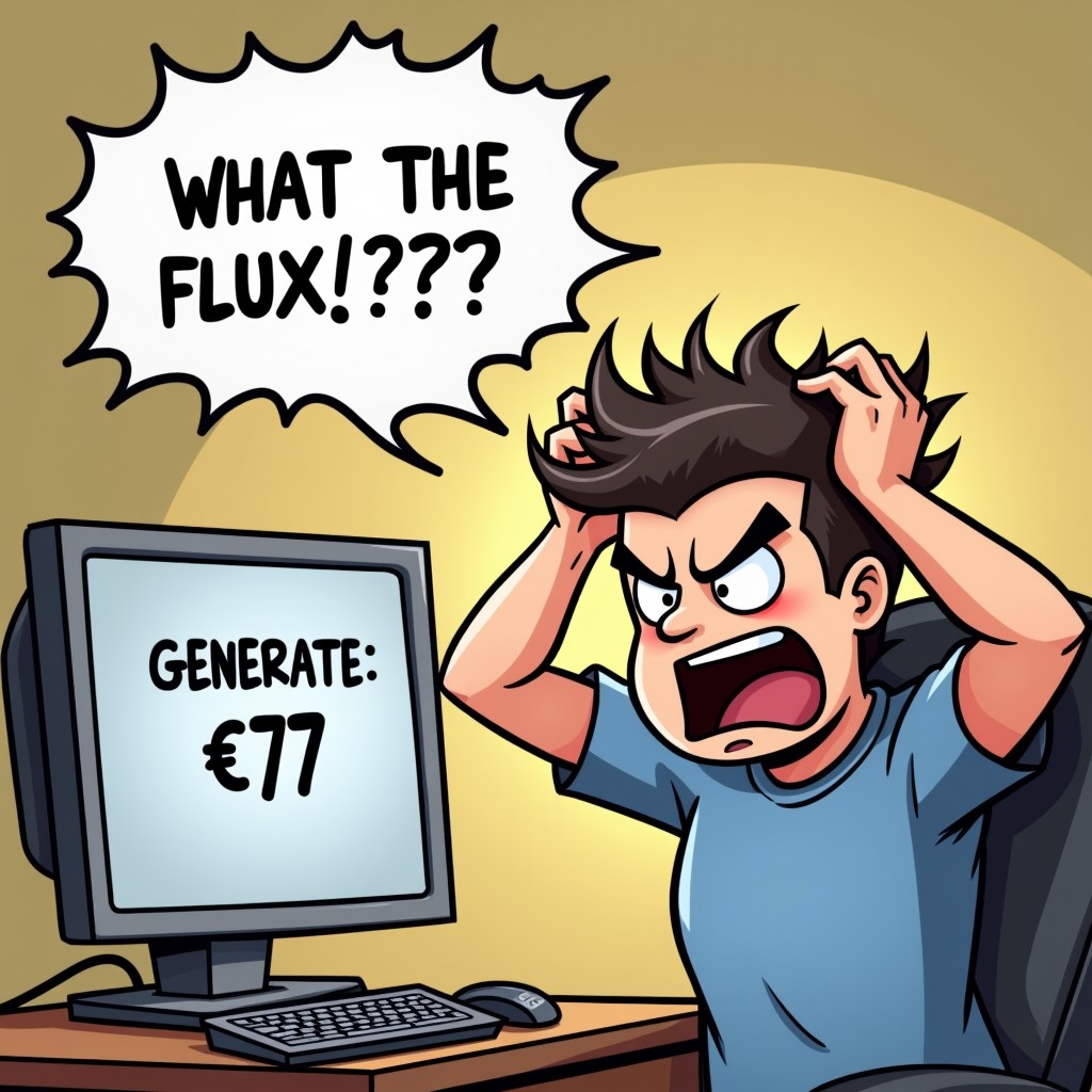 Cartoon of an enraged CivitAI user with both hands on his head pulling out his hair in anguish as he stares in horror at his computer screen, which reads "GENERATE: ⚡77". A speech bubble above the user's head reads "WHAT THE FLUX!?!?"