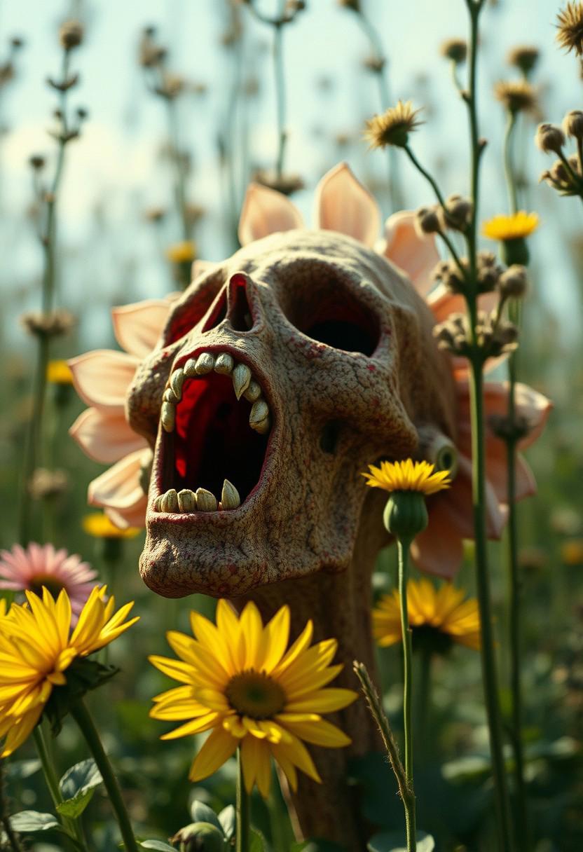 Unsettling, defiled, Midsommar meets annihilation, misery, existential dread, (By Larry Carlson:80), lifelike, daylight, bright, beautiful horror, flowery, (dark background details:.0), dynamic, Inspired by: midsommar (movie), annihilation (movie), Grainy film, implied horror, horror still, dof, realistic details, creepy aesthetic, detailed background, (style Jeremy Geddes:1.35), (Harsh lighting:1.2), cinematic, dramatic, raw, rating_safe, terrifying, ominous