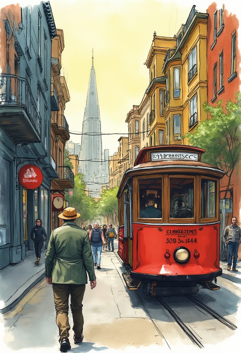 ink and watercolor sketch style.The scene depicts a bustling street in San Francisco ink and watercolor sketch style., with a red cable car prominently featured in the foreground. The cable car, labeled "SAN FRANCISCO" has a white roof and is moving towards the viewer. The driver and conductor are visible through the windows, ink and watercolor sketch style.. To the left, a man in a green jacket, brown pants, and a yellow hat is walking away from the viewer, his back turned. He appears to be a passenger on the cable car, but his face is not visible. ink and watercolor sketch style.The street is lined with multi-story buildings with ornate facades, featuring like balconies, windows, and decorative moldings. The buildings are painted in a ink and watercolor sketch style. variety of colors, including blue, yellow, and red, adding to the lively atmosphere. In the background, the Transamerica Pyramid is visible, towering over the cityscape. The sky is a warm yellow, suggesting either early morning or late afternoon light. The street is paved with cobblestones, and there are several parked cars along the sides. The overall scene iscapturing the essence of a bustling, historic urban setting. ink and watercolor sketch style.ink and watercolor sketch style.ink and watercolor sketch style.ink and watercolor sketch style.ink and watercolor sketch style.ink and watercolor sketch style.ink and watercolor sketch style