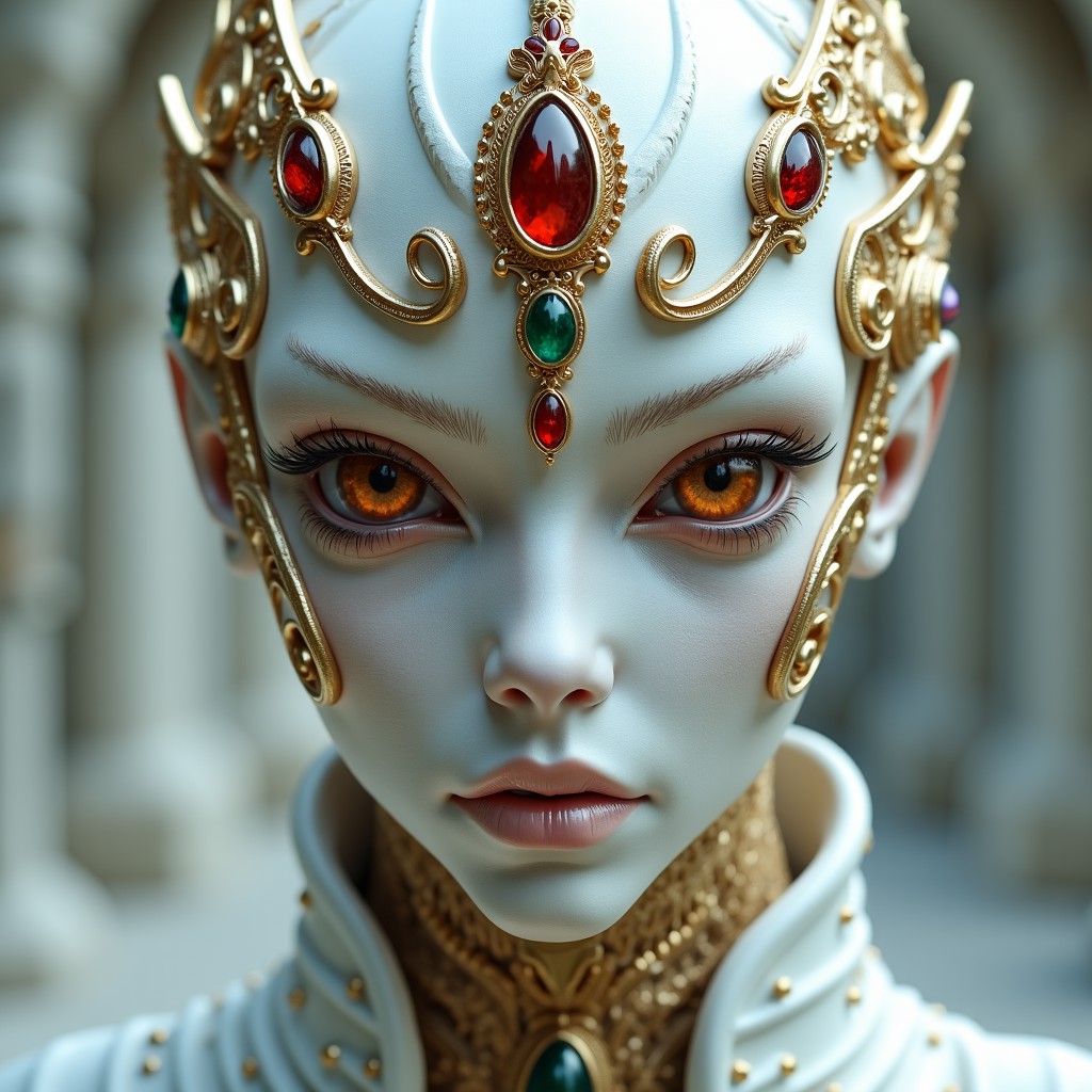 Face, in the style of dark white and light bronze, gold filigree, fierce alien priest on an alien planet, adorned with garnet, emerald, citrine and bloodstone gemstones, standing in ancient white marble temple, by Brian Froud and Heather Theurer, extremely detailed head and face, very realistic and symmetrical eyes, (eye contact with viewer), hyper detailed, hyper quality, artstation award winner, Epic realism, meticulous masterpiece, beautiful lighting, deep shadows