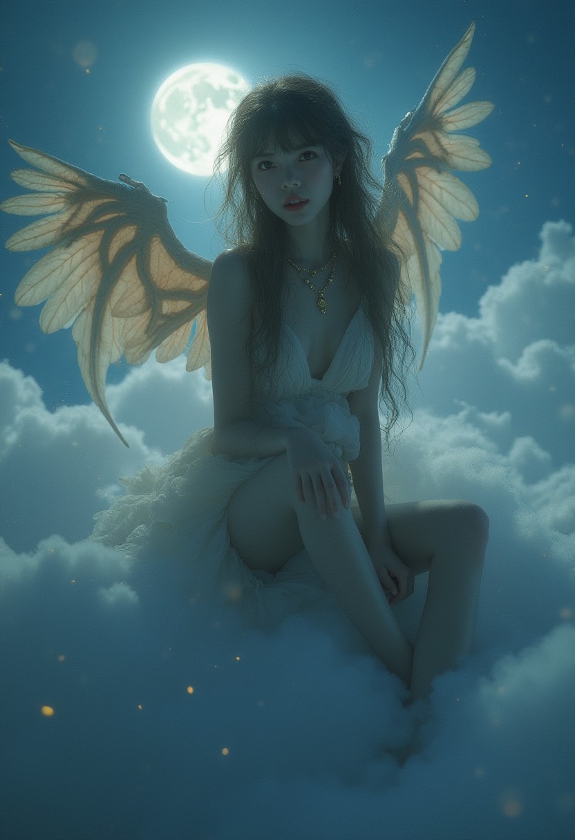 (Soft Lighting Photography by Mimoza Veliu and Mario Giacomelli:1.2), ((best quality)), ((masterpiece)), (detailed), alluring succubus, ethereal beauty, perched on a cloud, (fantasy illustration:1.3), enchanting gaze, captivating pose, looking at viewer, delicate wings, otherworldly charm, mystical sky, (Luis Royo:1.2), (Yoshitaka Amano:1.1), moonlit night, soft colors, (detailed cloudscape:1.3), (high-resolution:1.2), NSFW,