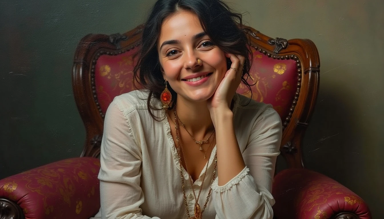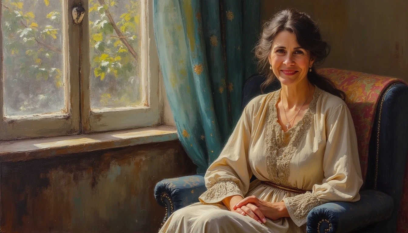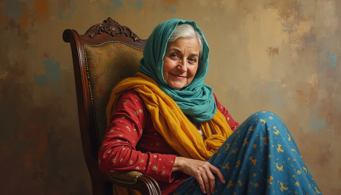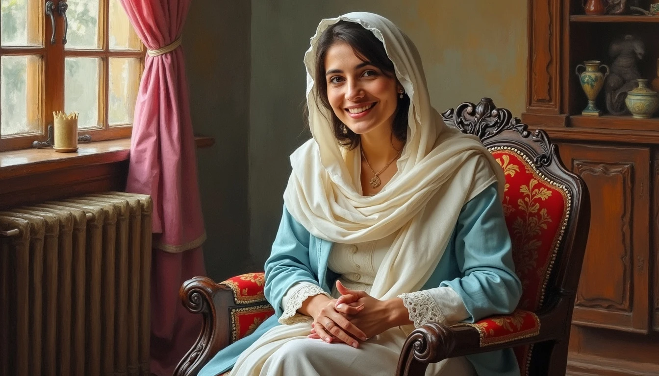 The image of a beautiful and kind Persian mother sitting on a chair and looking at the camera with a kind smile , art oil painting style