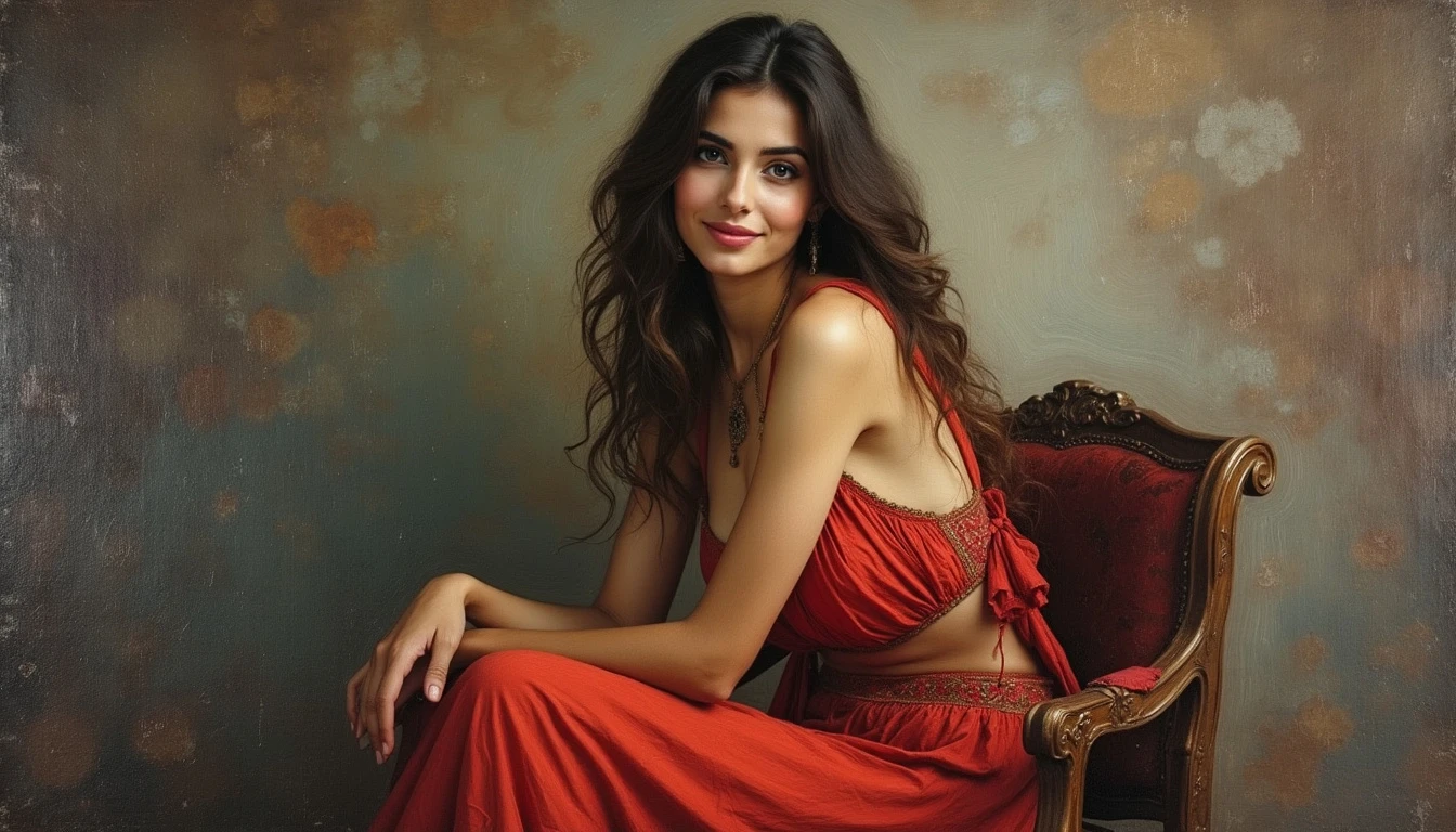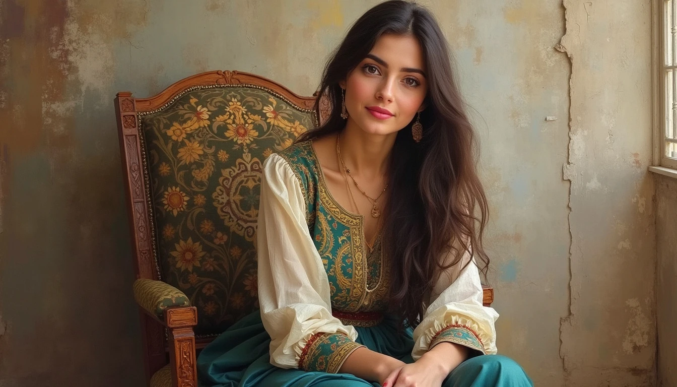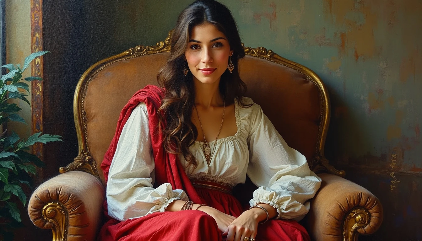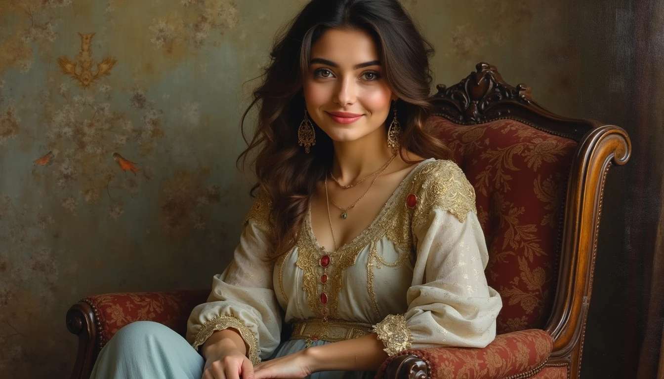 The image of a beautiful and kind Persian woman sitting on a chair and looking at the camera with a kind smile , art oil painting style