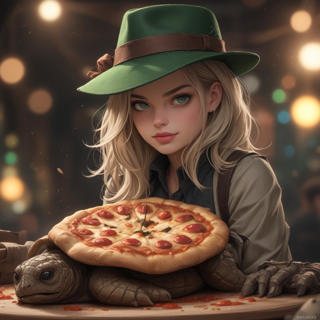 a gun, master splinter, fedora, neon operator margot robbie, hat, dramatic lighting !n-9, featured on amiami, pizza universe, big turtle shell, orelsan, slash page, trending in cgsociety, green hat, bokeh, perfect face