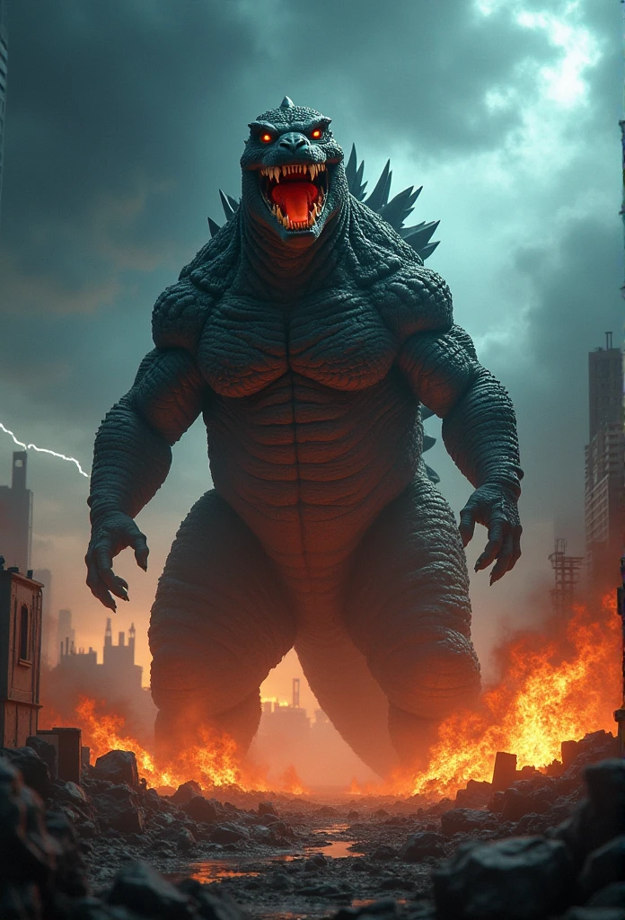 The image shows a large, monstrous creature that looks similar to Godzilla. It has sharp teeth, glowing orange eyes, and appears to be covered in scales or rough skin. The creature is standing amidst flames and smoke, with destroyed buildings in the background. The sky is stormy and filled with dark clouds and lightning