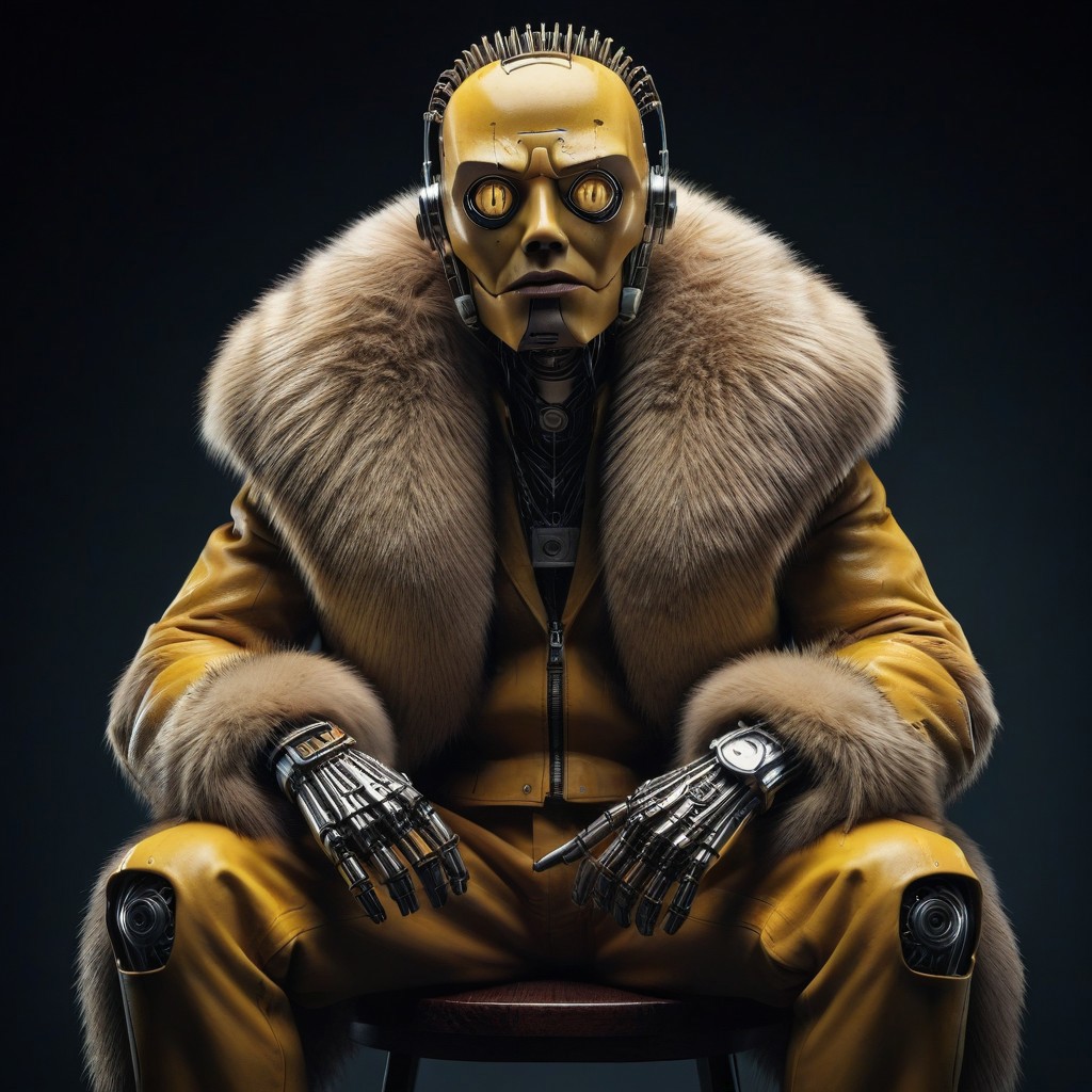 A detailed crying robot wearing a yellow jacket with fur collar, sitting on a chair, furcoat, evang, detailed face, detailed hair