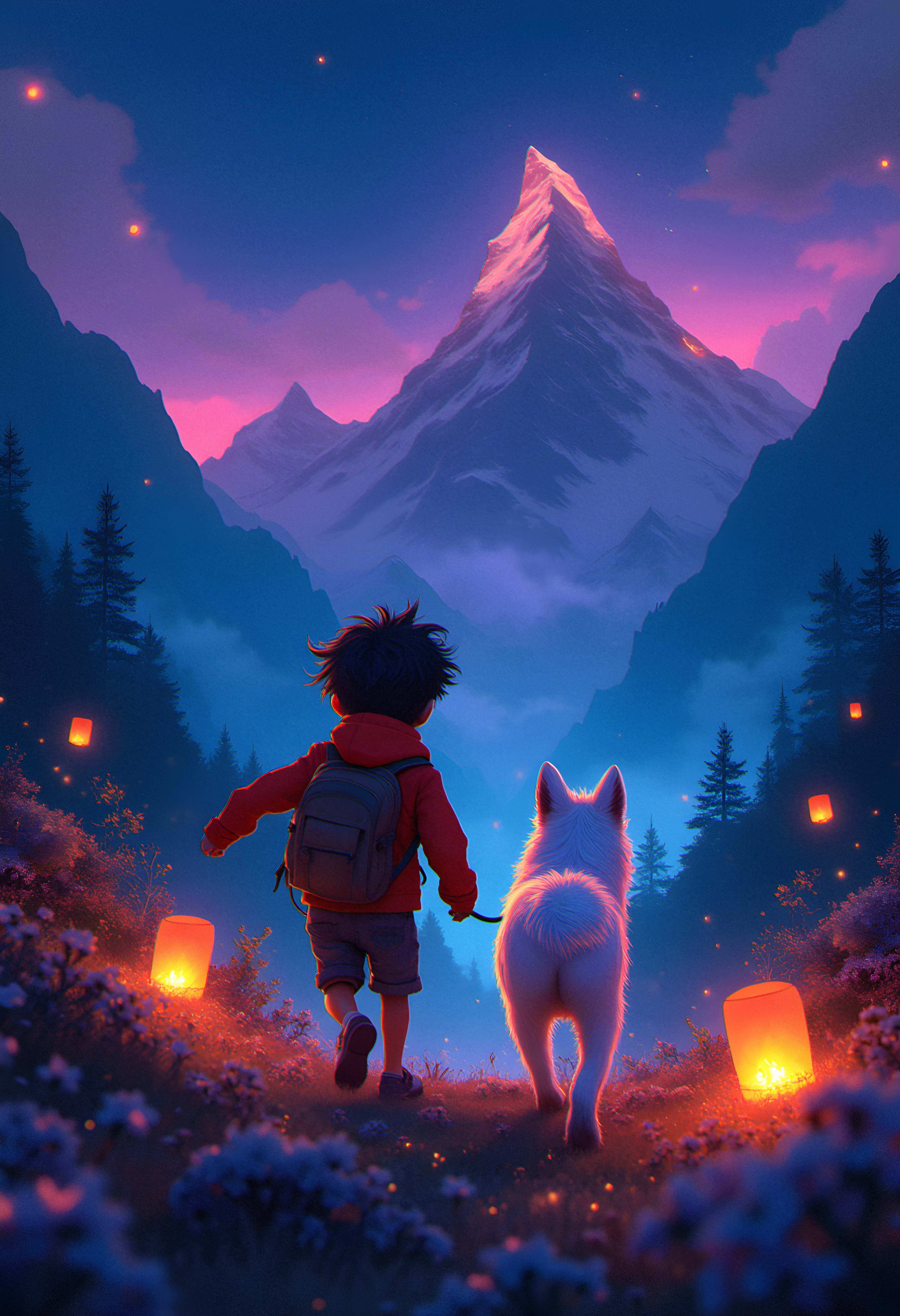 Digital Art: A diminutive boy appears resolute as he charges forward, with a wide-eyed expression full of wonder, escorted by his snowy white dog who mirrors his adventurous spirit with alert ears and wagging tail; nightfall enhances their frames, creating dramatic shadows still rich in color. They tread through an otherworldly landscape carpeted with bioluminescent flora and festive floating lanterns illuminating their path. Towering mountains capped with surreal fog embellish the horizon, thick with violet and cobalt hues from a star-saturated sky. Their forms, vividly outlined and dynamic, convey motion and destiny. Style of *Loish*, *Ross Tran*, *Abe Taraky*.