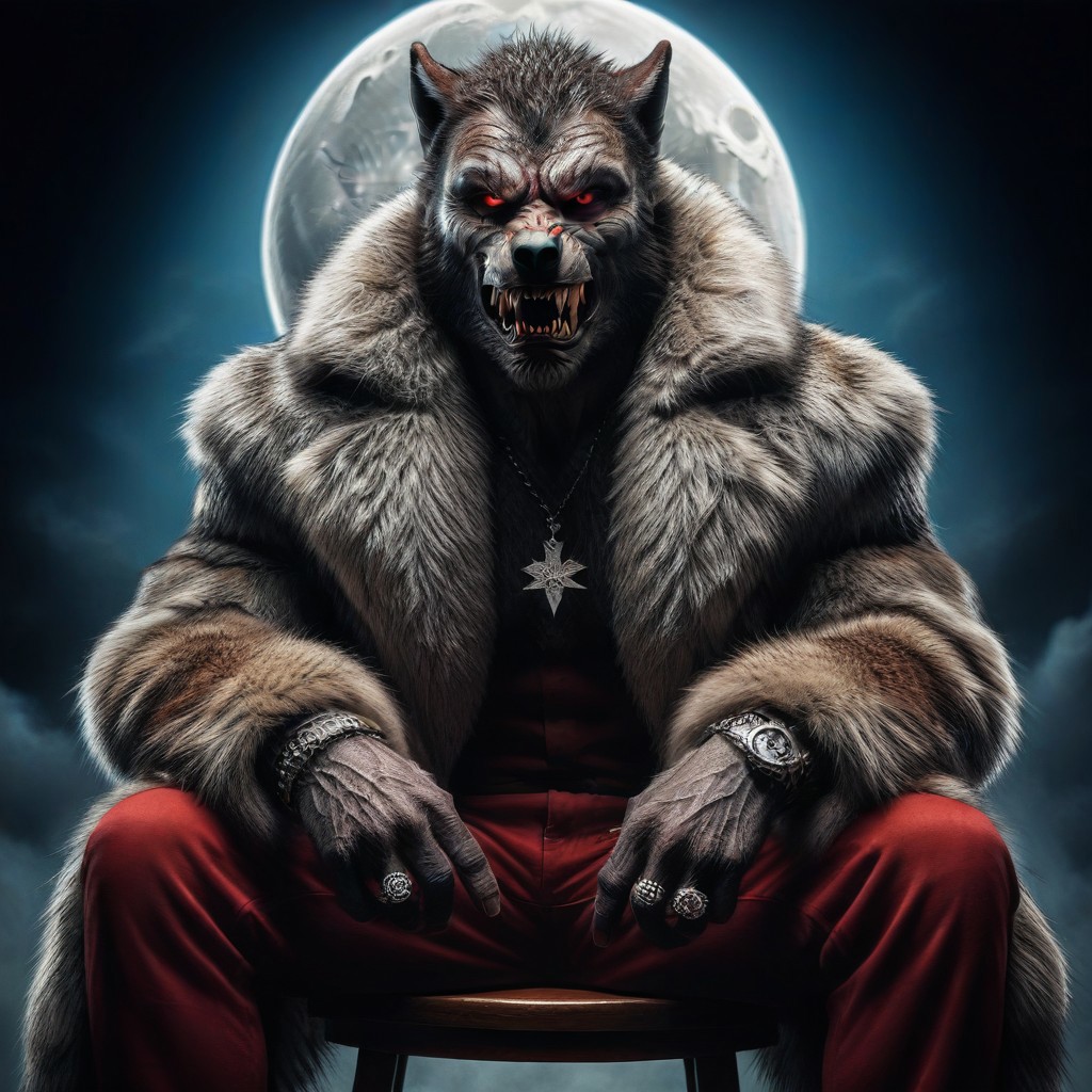 Detailed werewolf with red eyes , furcoat, moon in the background, sitting in a chair, evang, detailed face, detailed hair