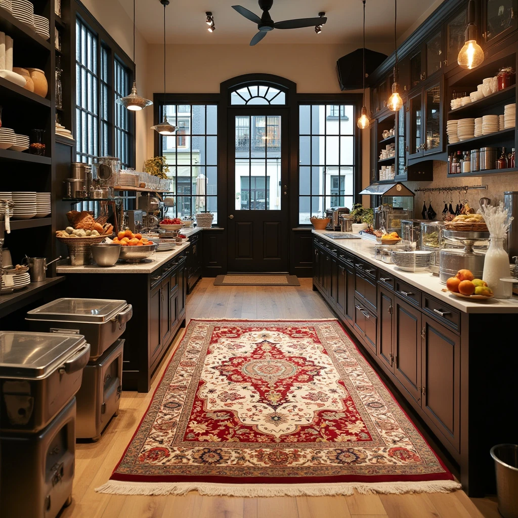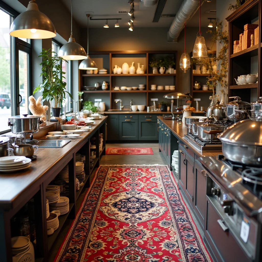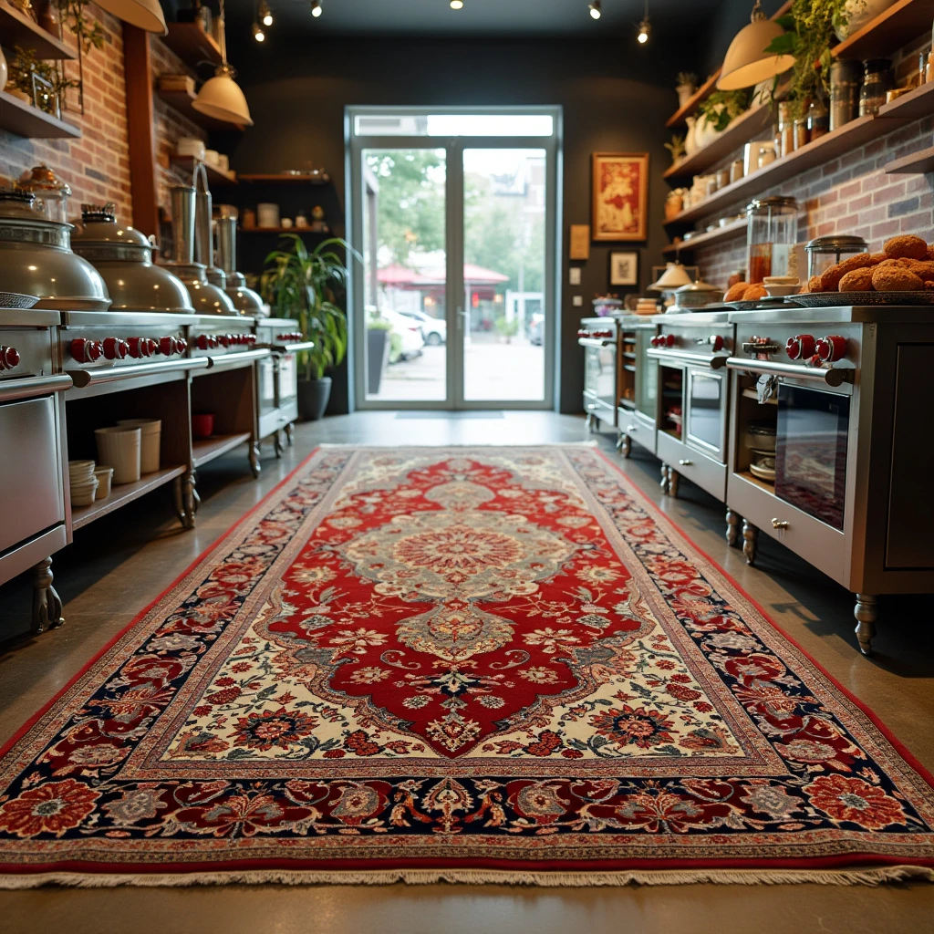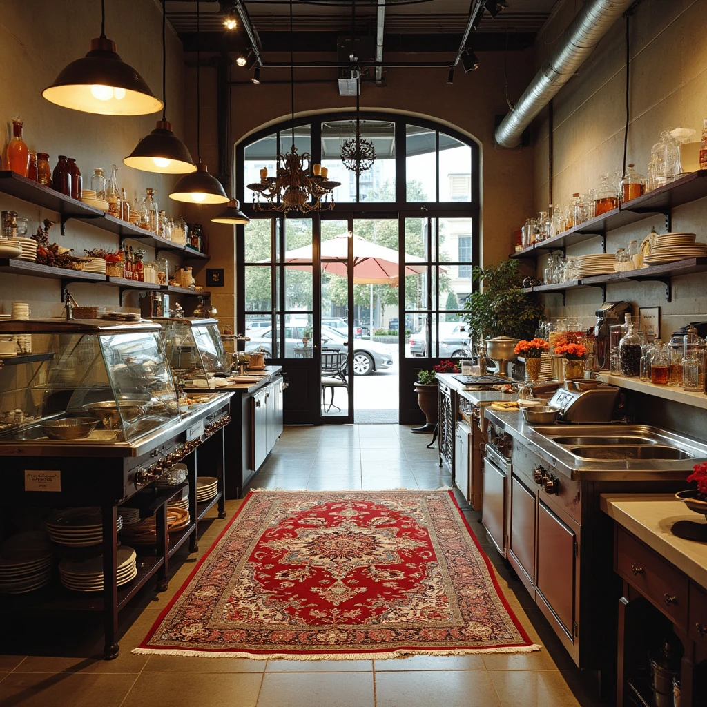 Showroom of business selling catering equipment and a Persian carpet on the floor