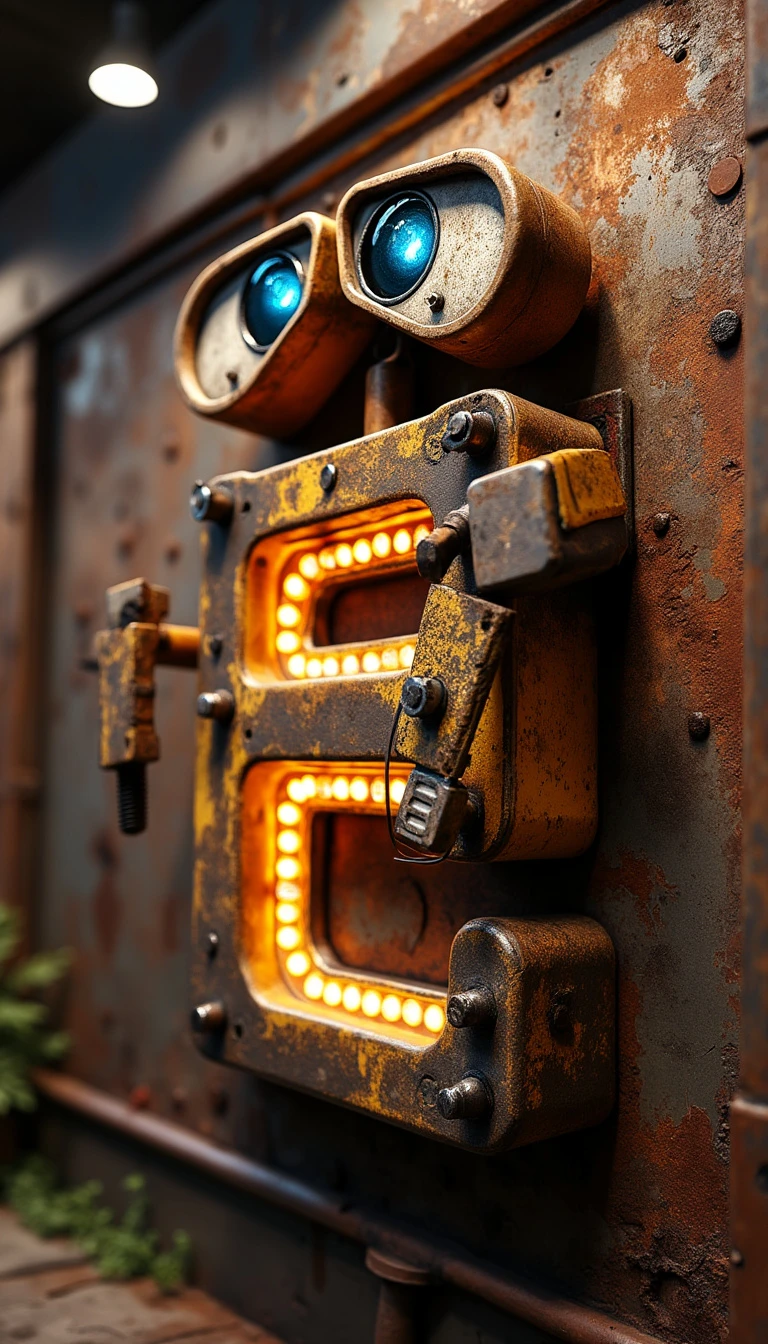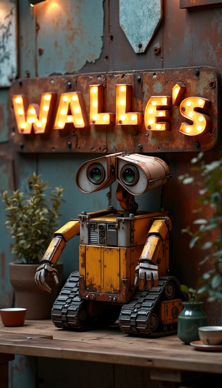 “Design an extraordinary shop sign for a takeaway coffee shop with a ‘WALL-E’ inspired aesthetic. The sign features the name ‘’ where the letter ‘E’ is a large, three-dimensional, illuminated letter, reminiscent of WALL-E’s eyes. The letter ‘E’ is designed to be slightly worn and industrial, with visible bolts, rust patches, and metallic textures, giving it a rugged, robotic feel. The rest of the word ‘Wayne’s coffee’ is also three-dimensional but slightly smaller, crafted from similar materials, blending futuristic elements with a sense of age and wear. The ‘E’ is the centerpiece, glowing with soft, warm light from within, creating a captivating focal point. The lighting around the sign is cinematic and dramatic, with deep shadows and focused beams highlighting the textures of the metal and the details of the construction. The overall lighting gives the sign a moody, atmospheric feel, as if it were part of a scene from a futuristic, post-apocalyptic film. The background of the sign is a mix of rusted metal panels, possibly salvaged from old machines or scrap, adding to the industrial, WALL-E inspired aesthetic.