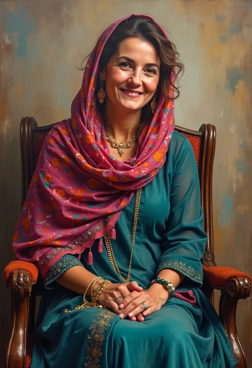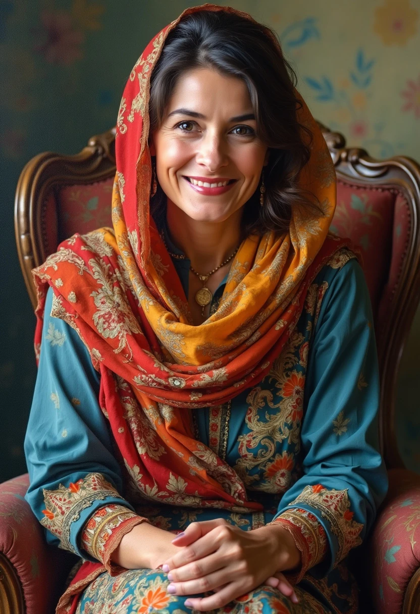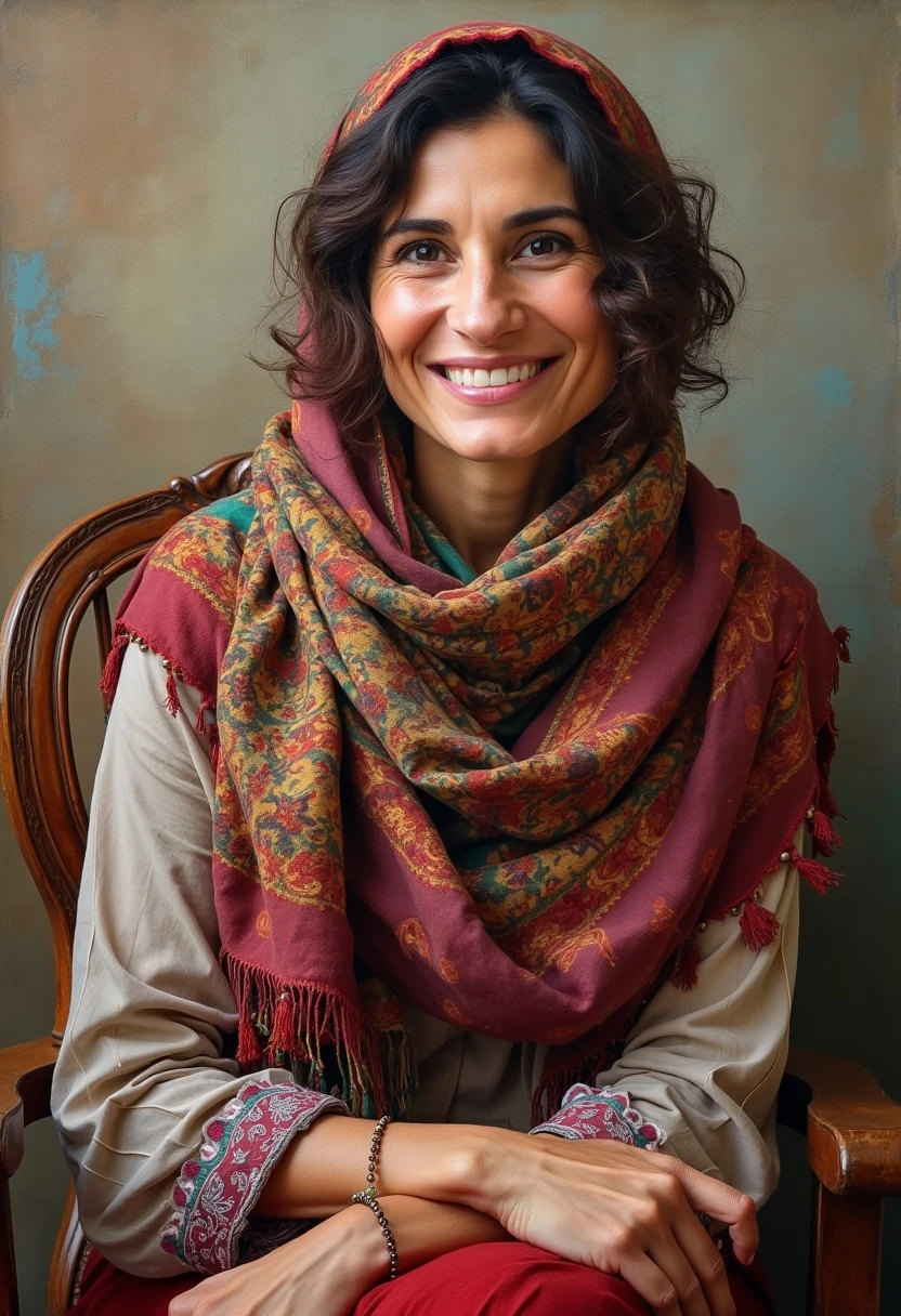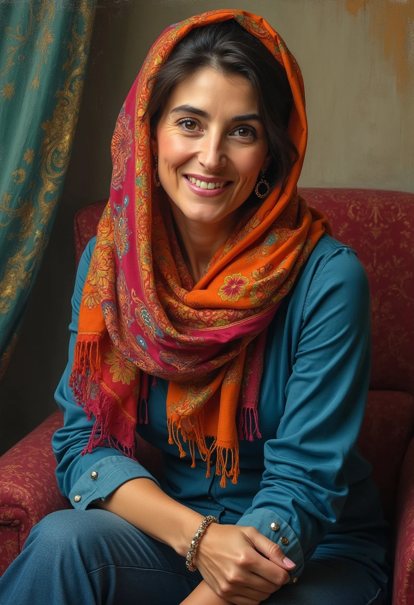 The image of a beautiful and kind Persian woman in 35 ages, with colorful scarf ,sitting on a chair and looking at the camera with a kind smile , art oil painting style