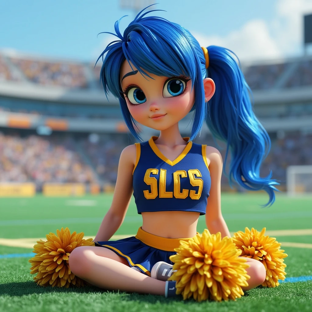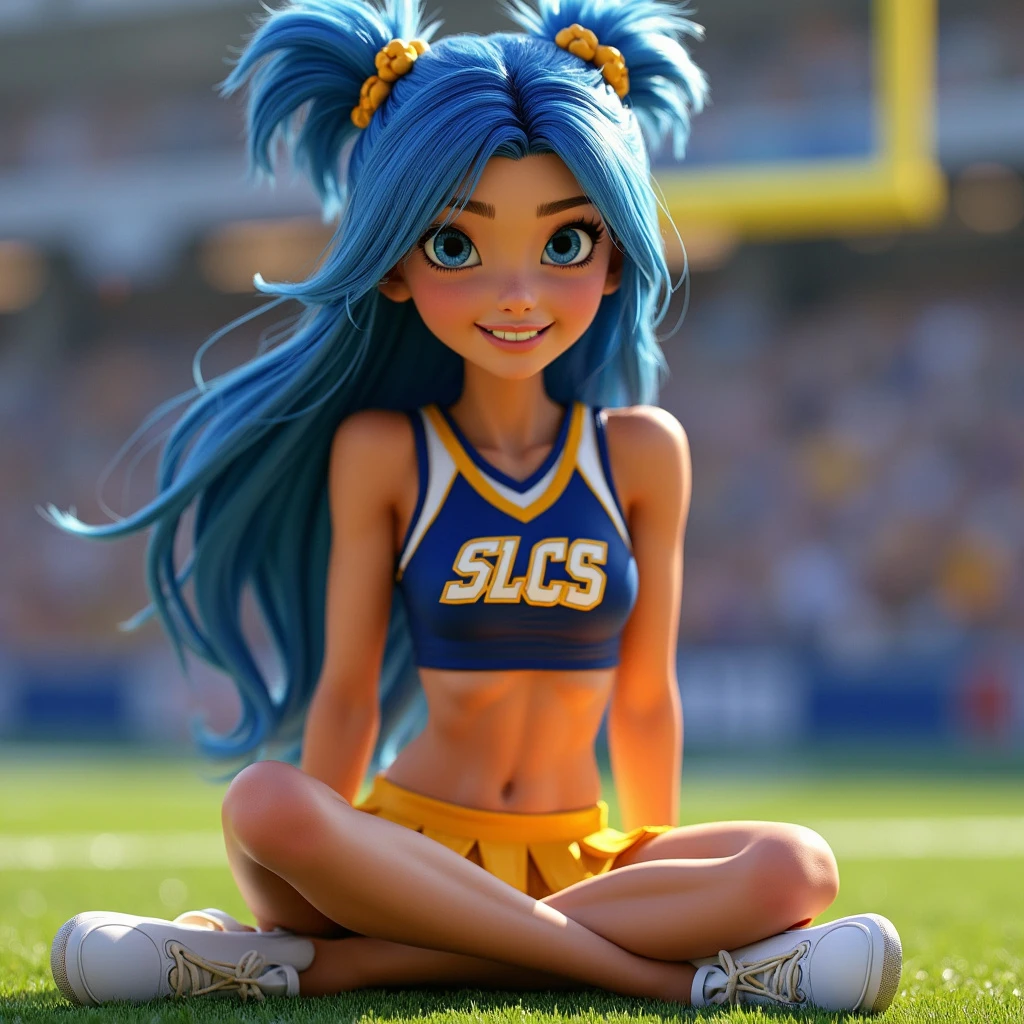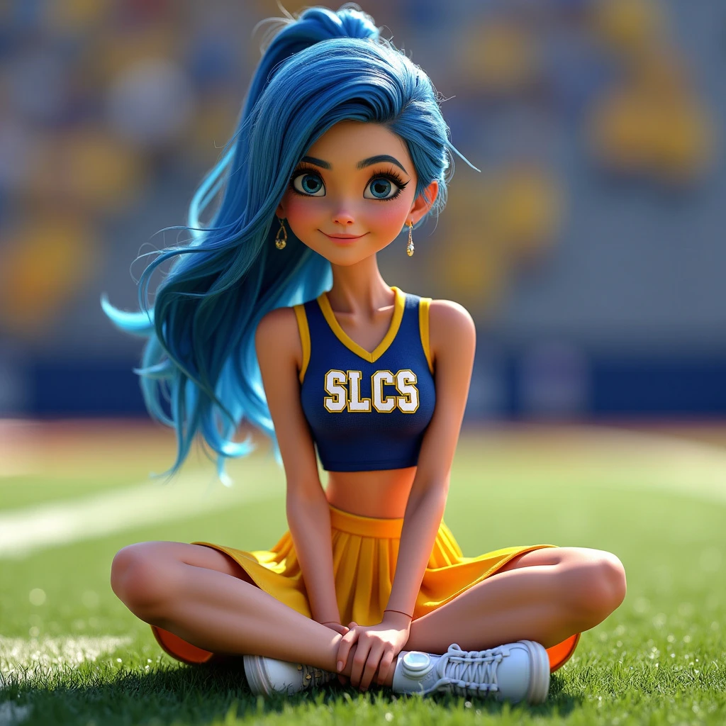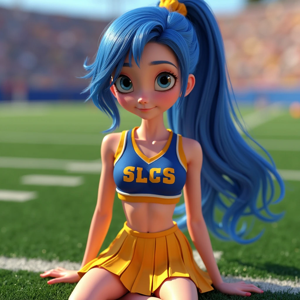 Disney Pixar movie 3D character. Stunning woman in her 20s 22 blue hair blue eyes. Sitting on AstroTurf. Cheerleader. Uniform blue and gold. Pleated yellow skirt. Cropped sleeveless top with the letters SLCS.