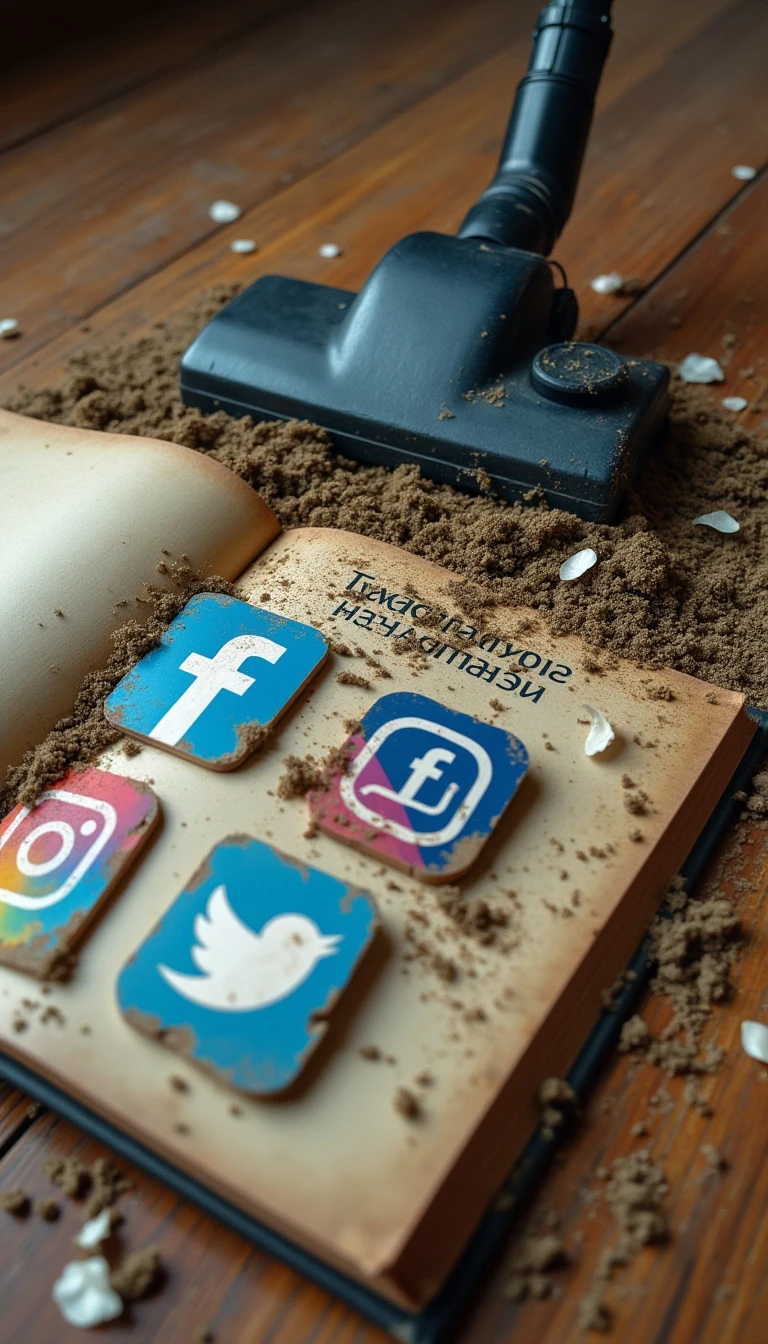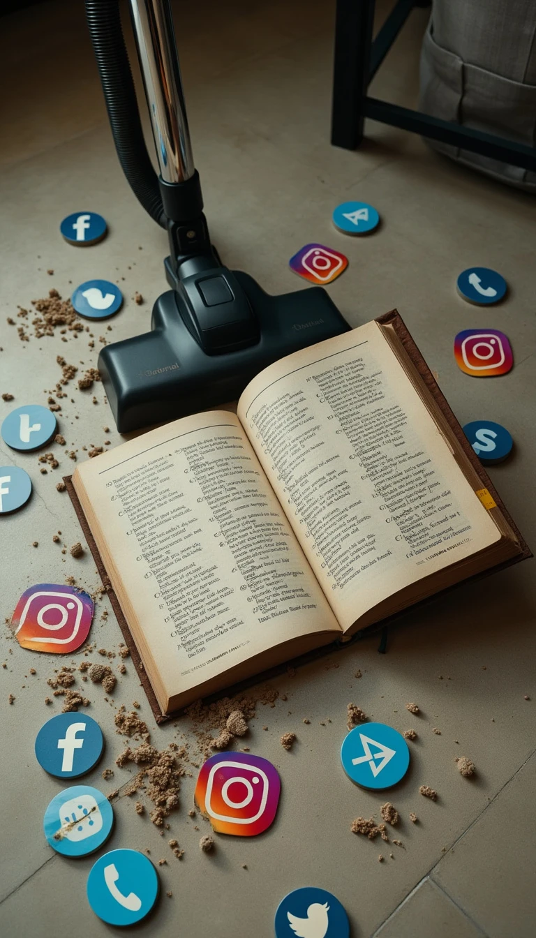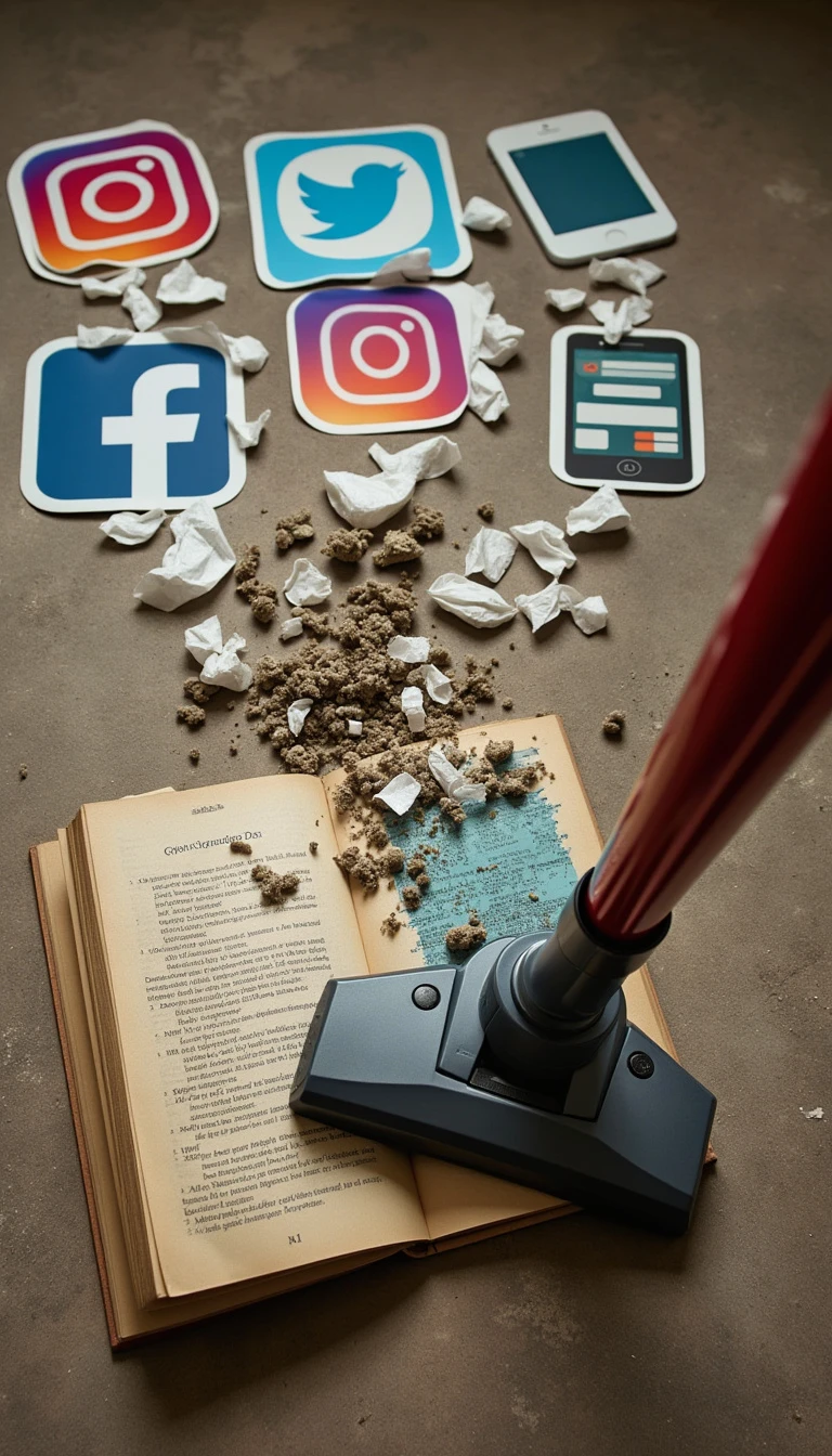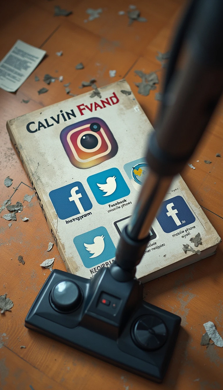 A book marked with “Calvin Fvand”. There is on the floor logo of Instagram, Telegram, Facebook, Twitter, mobile phones, and cyberspace. The book is pointing the vacuum cleaner towards these trash.
