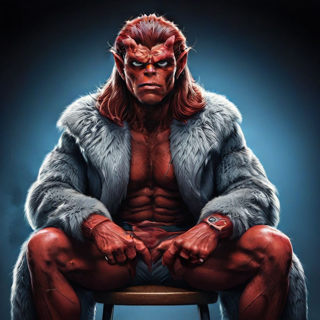 gargoyles_comic, red skin sitting on a chair, furcoat, evang, detailed face, detailed hair