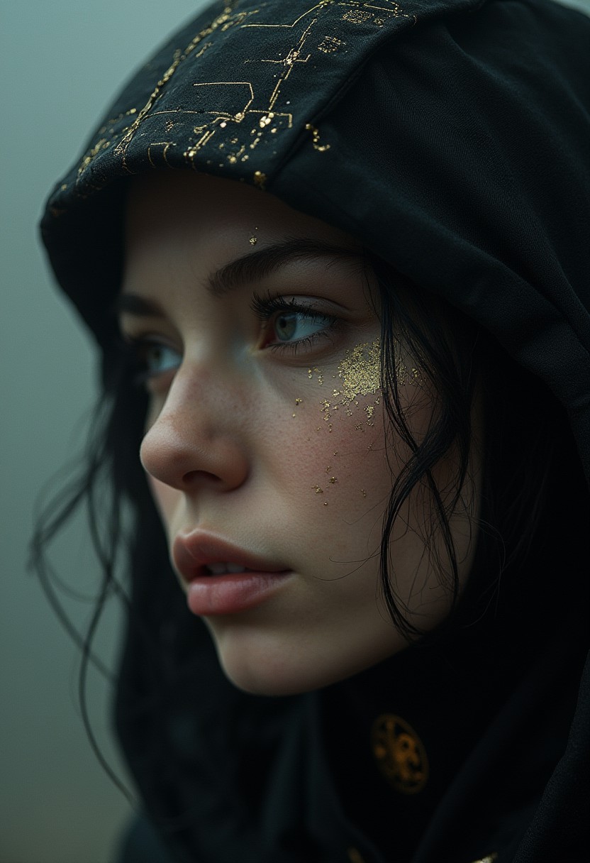 (Soft Lighting Photography by Mimoza Veliu and Mario Giacomelli:1.2), Photo of TWbabeXL01, NSFW, Super face Closeup Portrait,(cyberpunk face augmentation), (gold color circuit board tattoos on face), epic skin detailes, Sci-fi Darkness, a quiet Fighter, feudal Ninja,robotic shinobi suit, (style Katy Grannan:1.35) , Satin texture, (Glitchy:1.5) (Foggy:1.35), (Harsh lighting:1.4), nipples