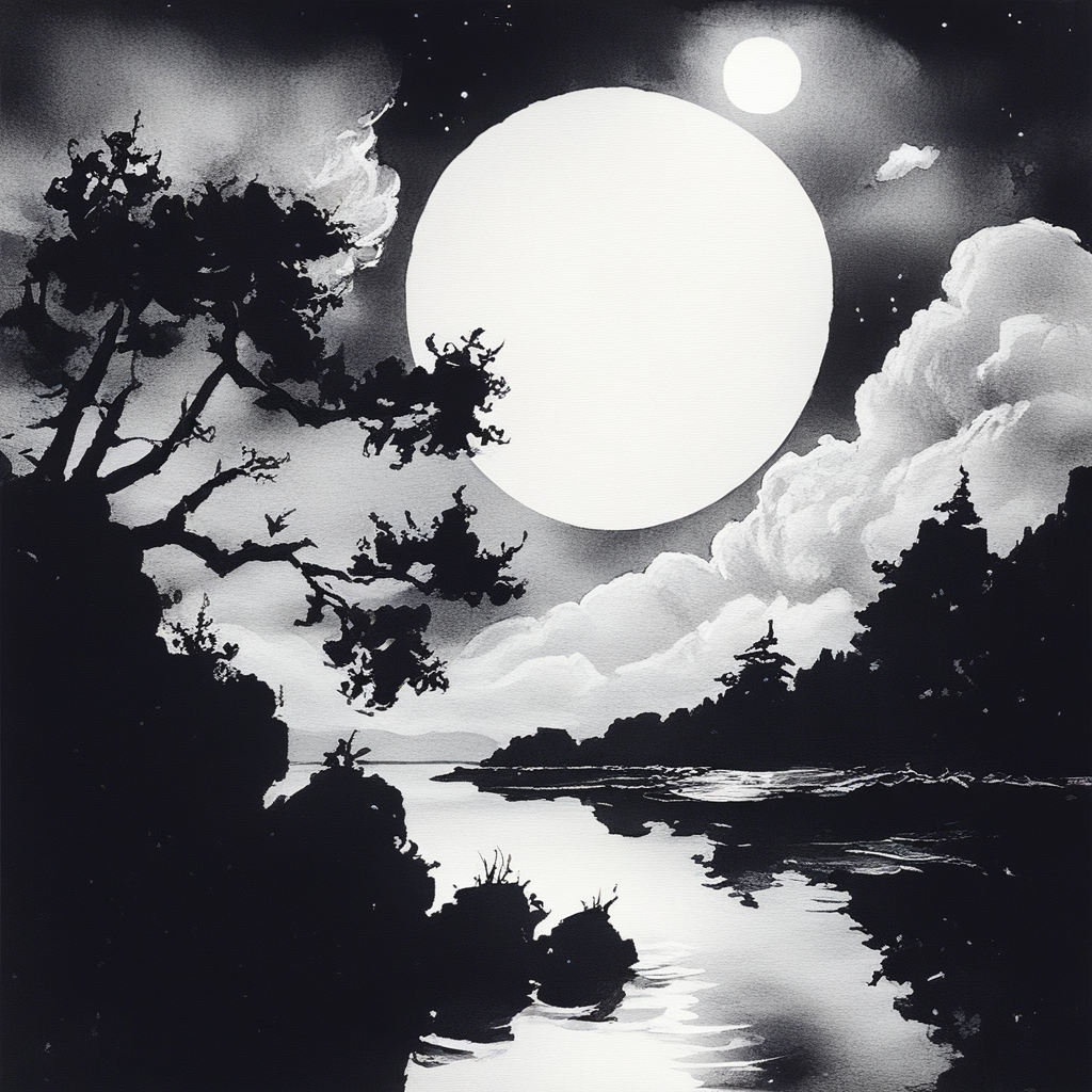 ArsMJStyle, Zen Ink Wash Sumi-e, A black and white photo of a river with a full moon in the sky., no humans, monochrome, moon, scenery, outdoors, tree, cloud, sky, greyscale, full moon