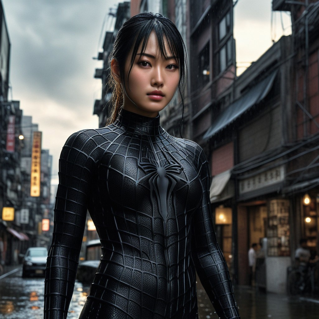 score_9, score_8_up, score_7_up, best quality, realistic, masterpiece, beautiful detail, hyperrealistic, night, ((1girl, woman body, large breast)), amazing detailed full body of a beautiful japanese girl, wearing a realistic and highly detailed black raimi spider-man suit, ((defined muscular girl)), professional model wears ultra - detailed black raimi spider - man suit, ultra - detailed and grained black raimi spiderman suit, suit covered entire body and hand, black spiderman gloves, wet, (through old japanese city), (dirty skin), close up, octane render, highly detailed, volumetric, dramatic lighting, (highest quality:1.1), (HDR:1.3), (top quality, best quality), realistic, high definition,