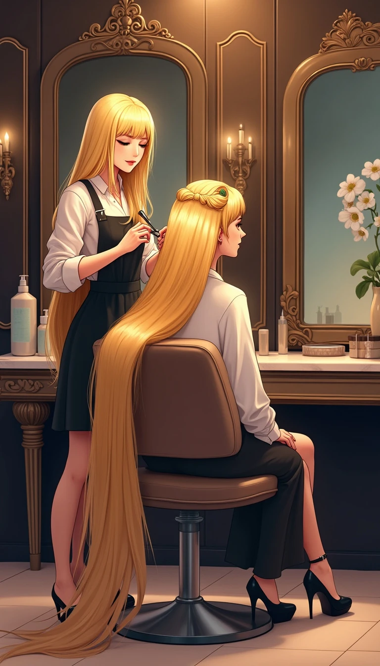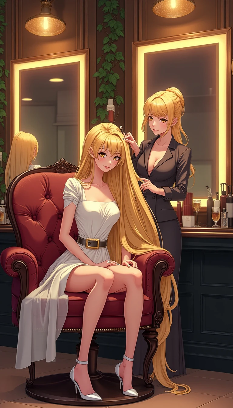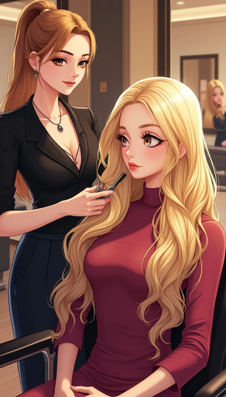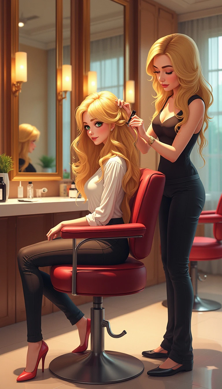 A luxurious hair salon with elegant decor, featuring a young blonde woman sitting in a plush salon chair. She is in the process of getting hair extensions, with the stylist carefully attaching long, golden extensions to her natural hair. The woman’s hair flows beautifully, with the extensions blending seamlessly. The stylist is focused, holding the tools needed for the procedure. The background includes high-end salon equipment, large mirrors, and soft lighting that highlights the luxurious ambiance of the salon. The picture is not Cartoon