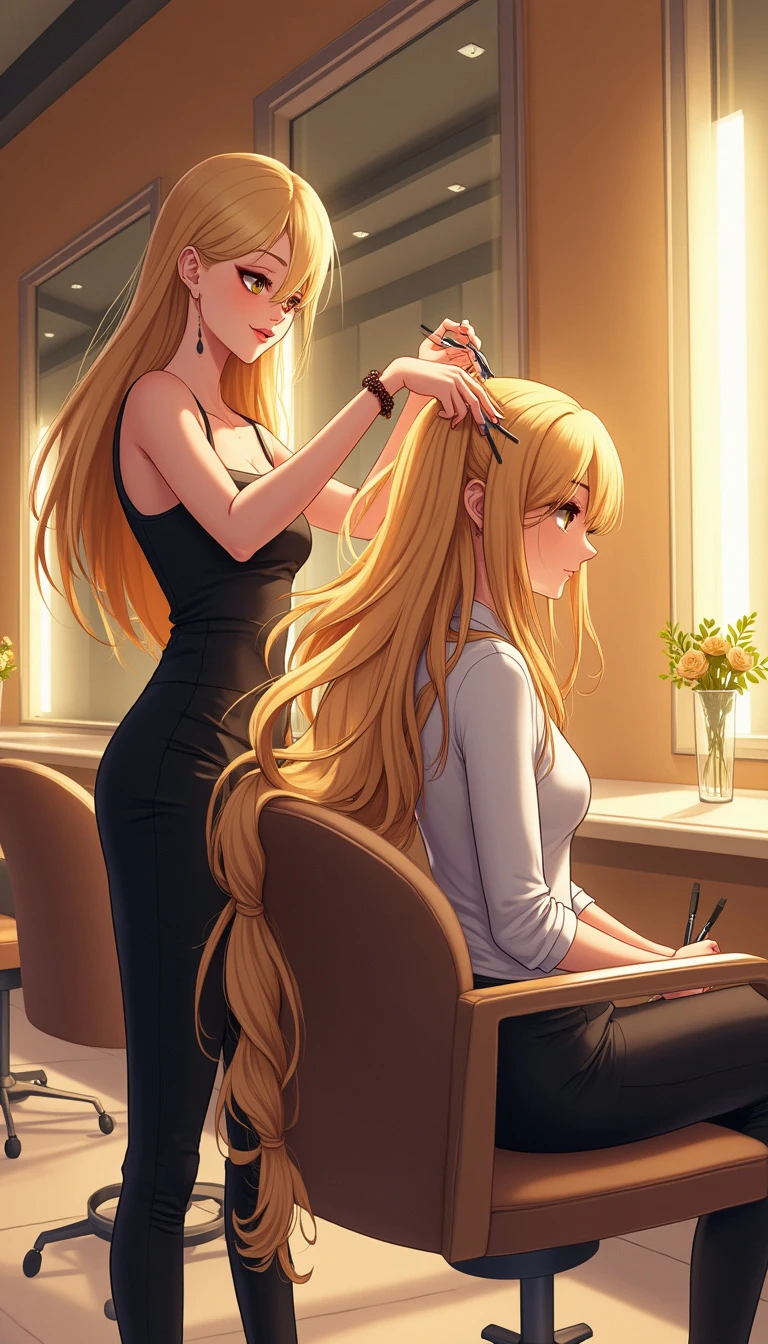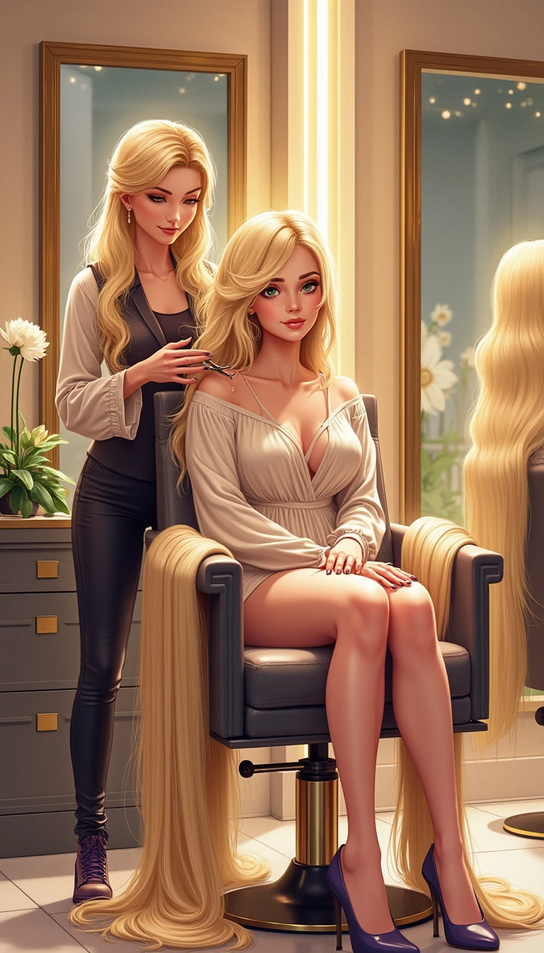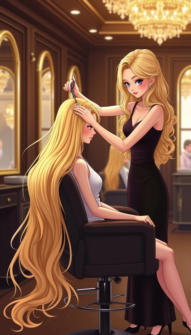 A luxurious hair salon with elegant decor, featuring a young blonde woman sitting in a plush salon chair. She is in the process of getting hair extensions, with the stylist carefully attaching long, golden extensions to her natural hair. The woman’s hair flows beautifully, with the extensions blending seamlessly. The stylist is focused, holding the tools needed for the procedure. The background includes high-end salon equipment, large mirrors, and soft lighting that highlights the luxurious ambiance of the salon. The picture is not Cartoon