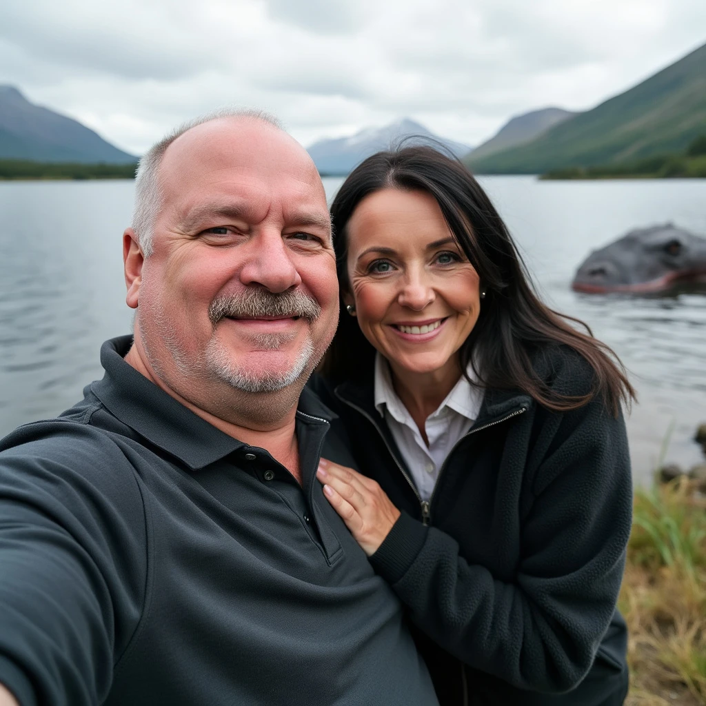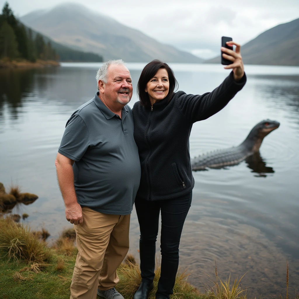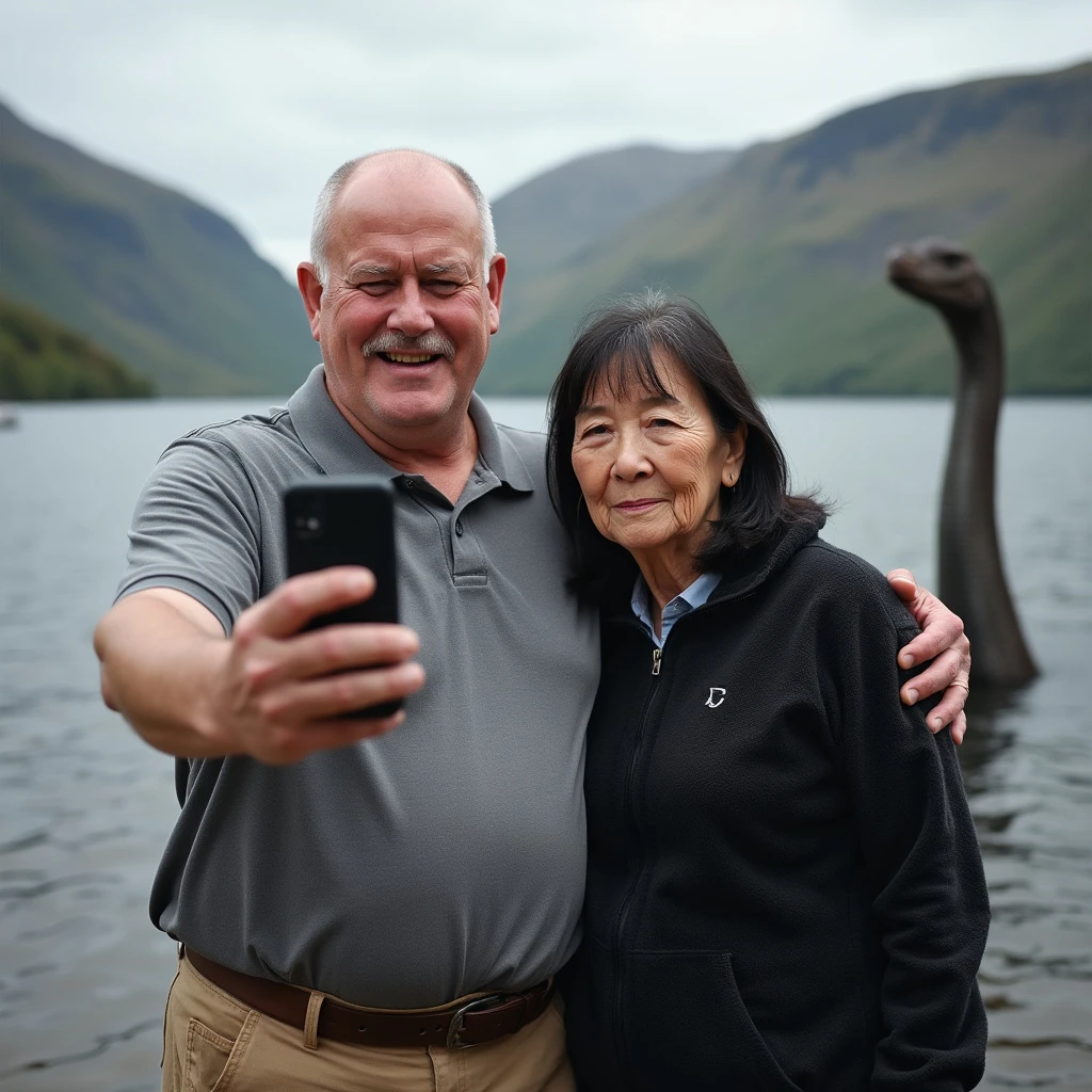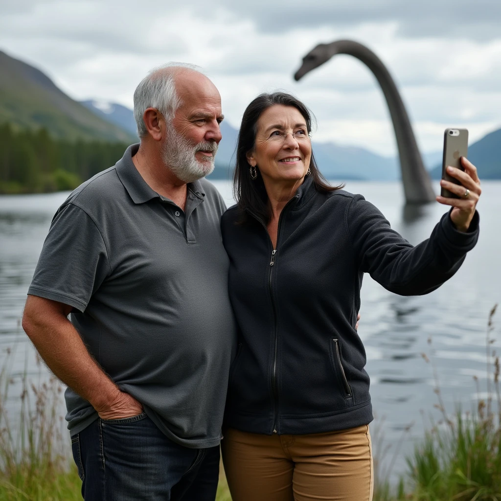 A photo of a white couple taking a selfie. The man is tall and the woman is short. The couple is a man and a woman. The man is an 65 years old Irish man, clean shaven and bald with grey hair around the sides. The man is slightly overweight and is wearing a polo shirt and tan trousers. The woman is 65 years old English woman and has straight black hair. The woman is wearing a black fleece with black trousers. Behind the couple is the Loch Ness monster in Loch Ness. The Loch Ness monster is looming towards the couple.