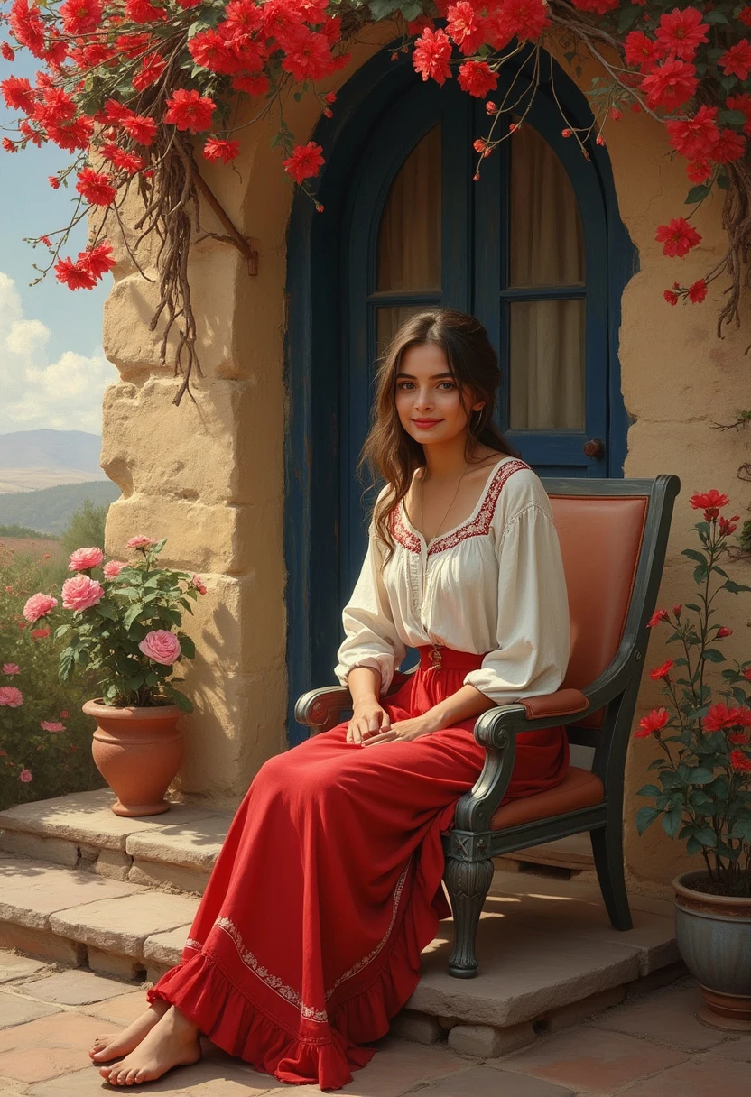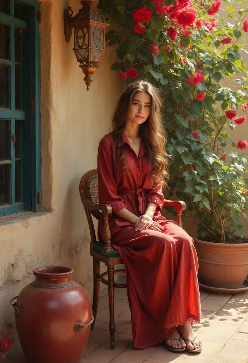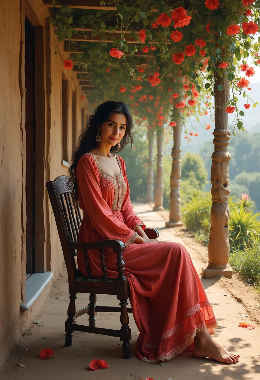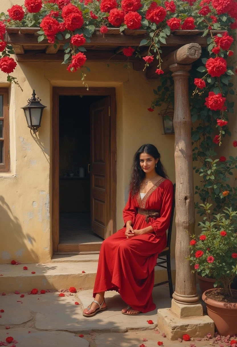 The image of a beautiful and kind persian , with usual daily dress ,sitting on a chair , Sitting on the terrace of the wooden house, Red flower pergola on mud walls , and looking at the camera with a kind smile , art oil painting style