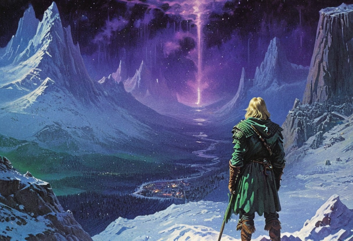 grainy, noise, gloom, glow, 1970s dark fantasy book cover paper art dungeons and dragons style, masterpiece, (high quality:1.1) BRAKE, snowy mountains, a tired traveler standing and looking at the mountains, blond hair, nighttime, darkness, stars, (snow flakes:1.2), northern lights, gradients, violet, green, blue