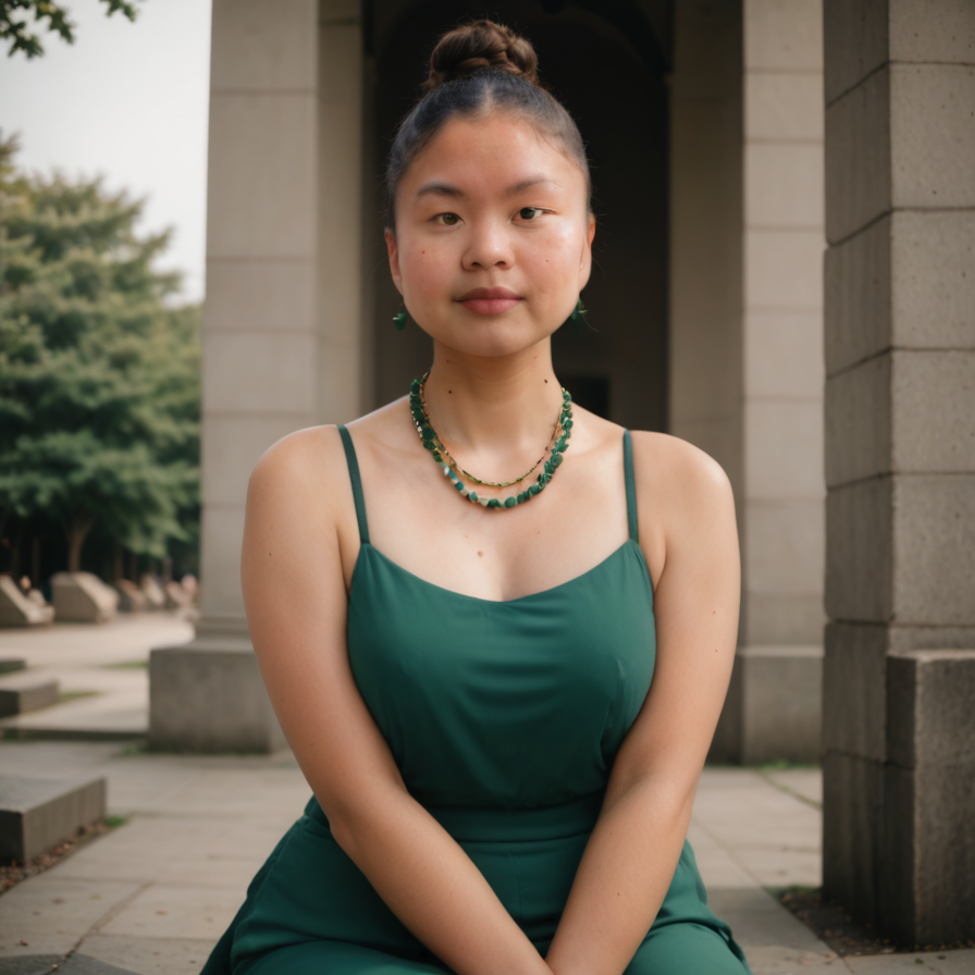 Canon EOS 5D Mark II (2008), soft fill lighting, (close up face photo of a woman), lying, BREAK (Emerald Braided bun), historical monument, commemorative statue, cultural significance, landmark, (Tangerine Polka dot blouse, wide-leg pants, block heel mules, layered necklaces, sleek bun.), <lora:Kali_XL:1>