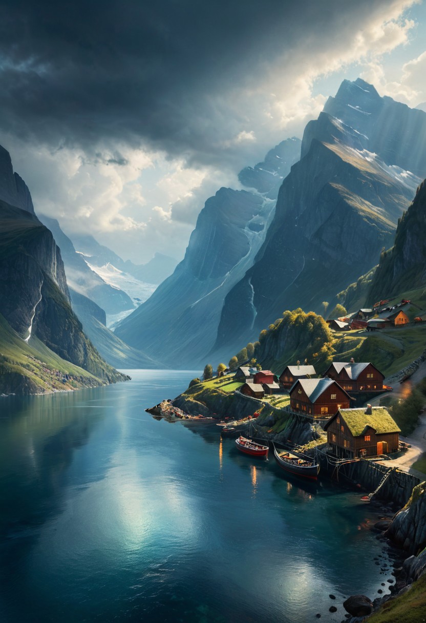 majestic fjords with small fishing villages nestled at their bases, breathtaking scenery, high detail, realistic landscape, vibrant colors, cinematic lighting, serene atmosphere, by Andreas Achenbach and Thomas Kinkade, 8k resolution, ultra HD, beautiful composition, highly detailed and hyper realistic photo, by Alena Aenami , by Archibald Thorburn , by Daniele Afferni , in the style of monochromatic silhouette reflection, limited dark palette, unusual dark colors, faded colors, atmospheric haze, highly dramatic cinematic lighting, motion blur, film grain, professional, excellent composition, finest details, maximized details, ultimate detail level, masterpiece, best quality