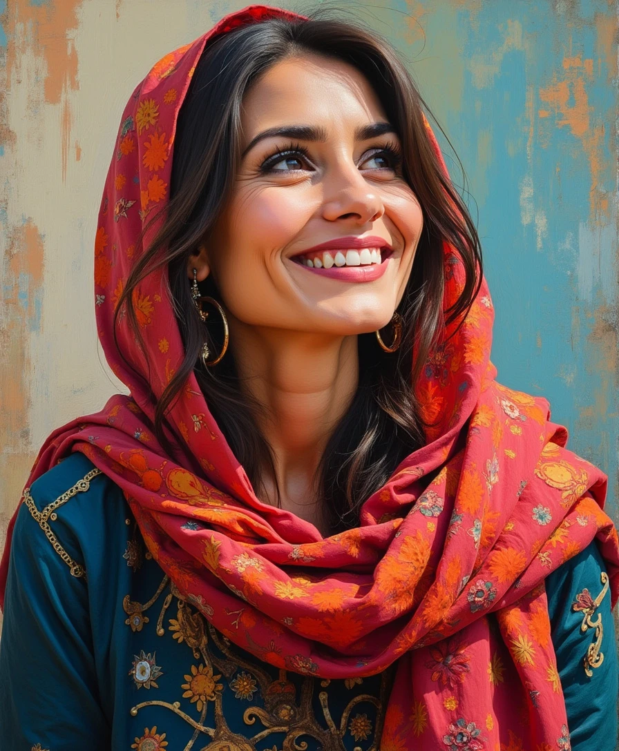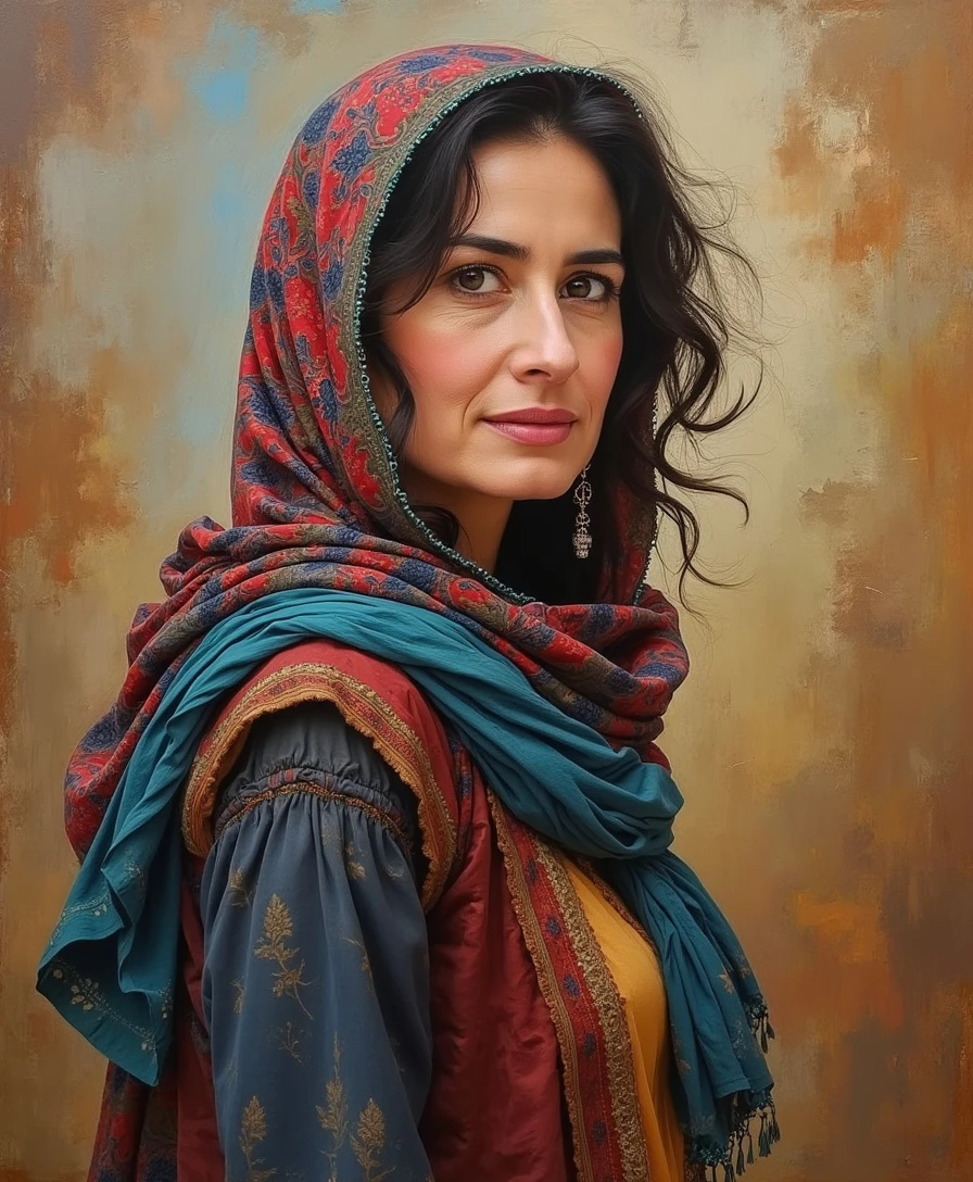 a painting of an oil painting of a adult woman persiana woman, with usual daily dress ,with color full scarf , in the style of Inessa garmash, konica auto s3, ahmed morsi, johan messely, frayed, painted illustrations