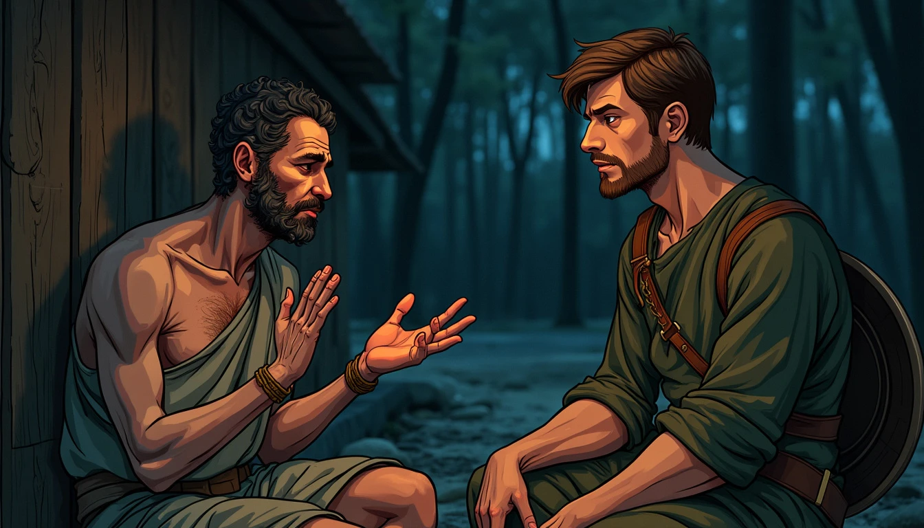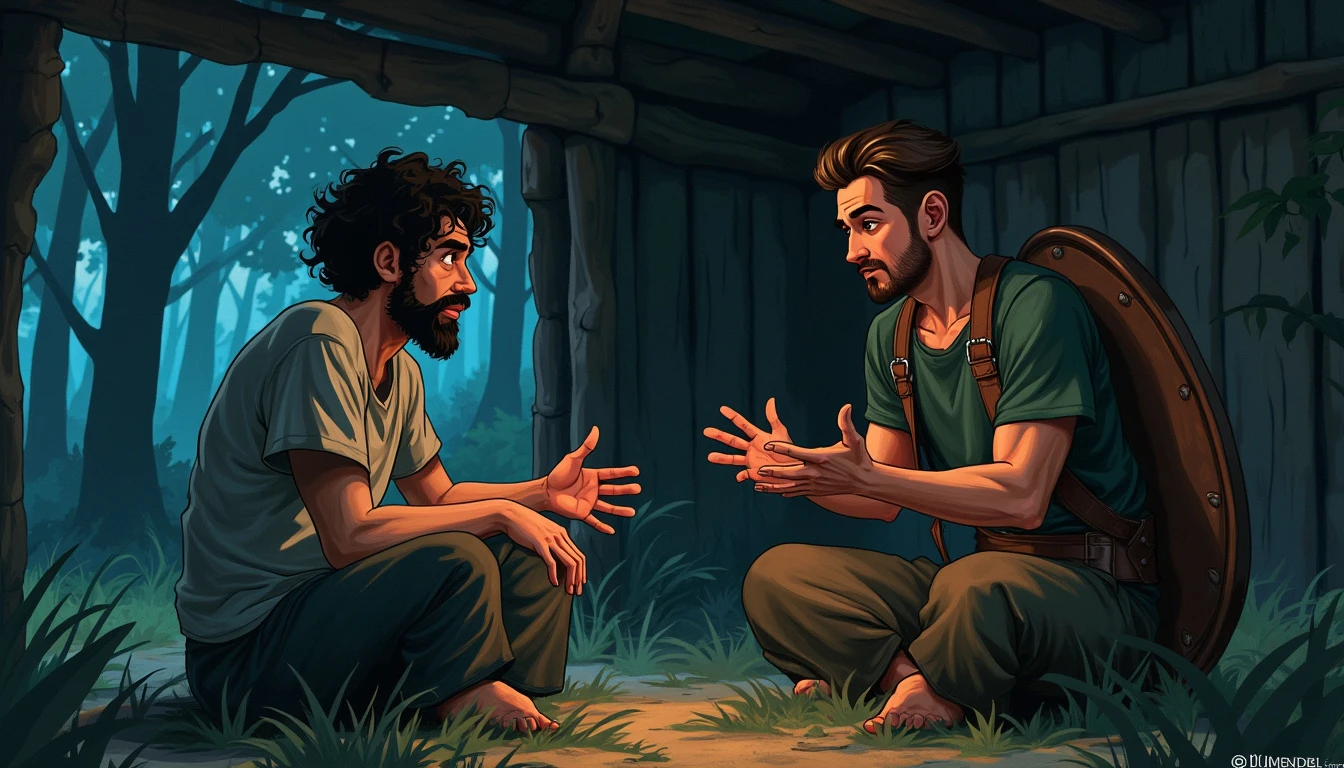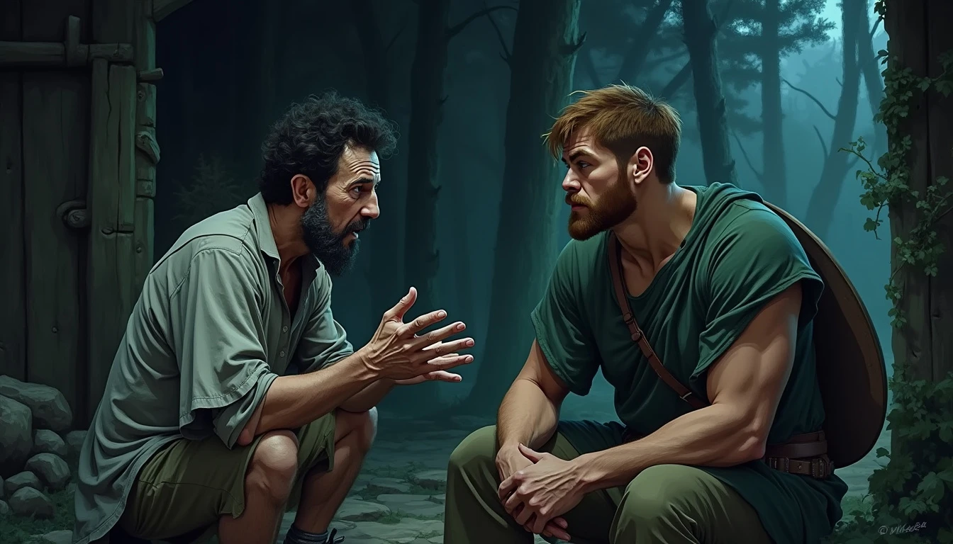 In a digital painting style, a mid-level shot captures the dark interior of a forest village hut at night time. Maksat Zhalgas, a frail village man, is earnestly explaining something to Taran, gesturing with his hands as he speaks. Maksat, with his sad face, weak eyes, and short curly black hair and beard, wears shabby grey one off shoulder cloth. Opposite him, Taran listens intently, his strong muscular, brave presence emphasized by his tanned skin, straight brown hair, and a short beard. He wears a slightly worn dark green half-sleeved tunic, secured with a brown leather belt. He has a small round shield strapped to his back. Outside is night time. Distorted, Abstract, Impressionist