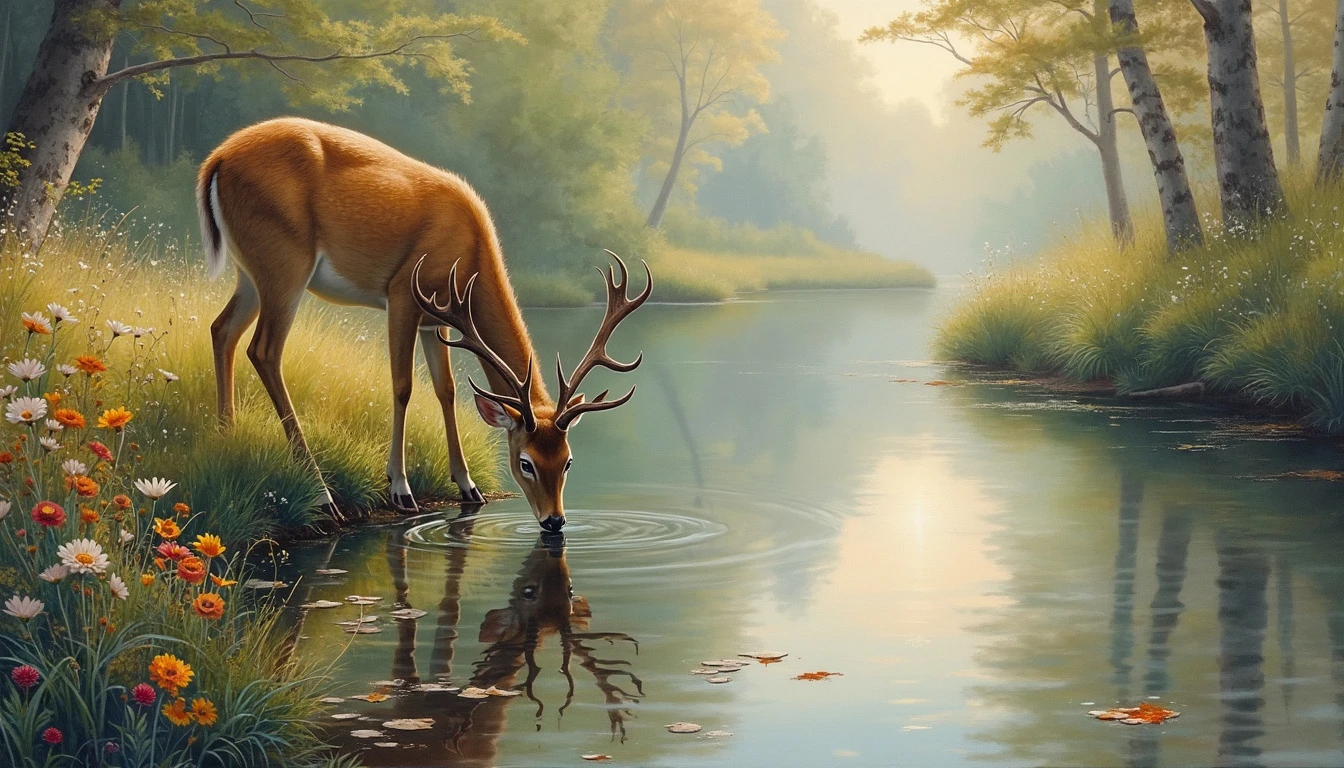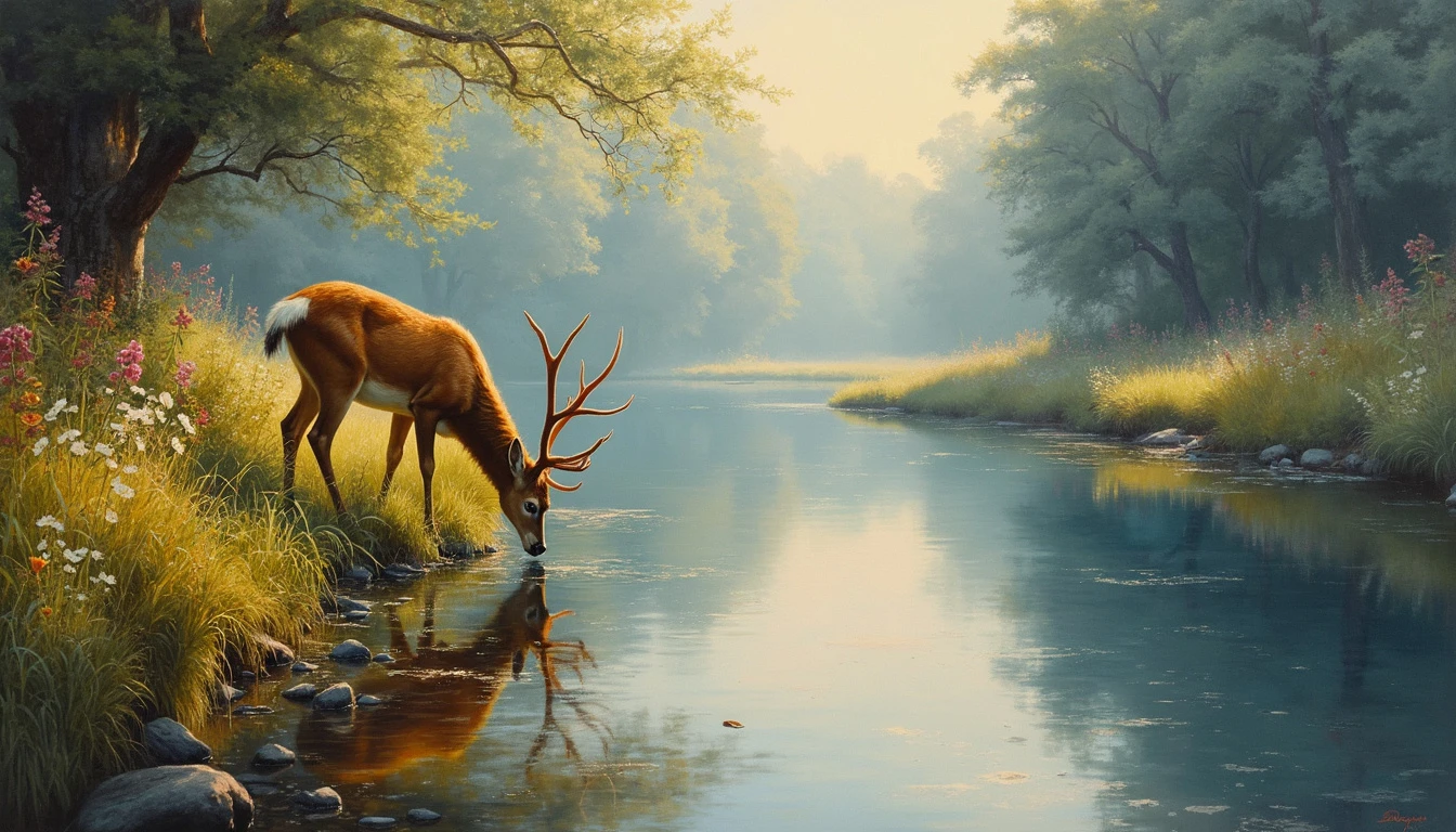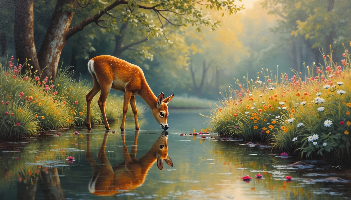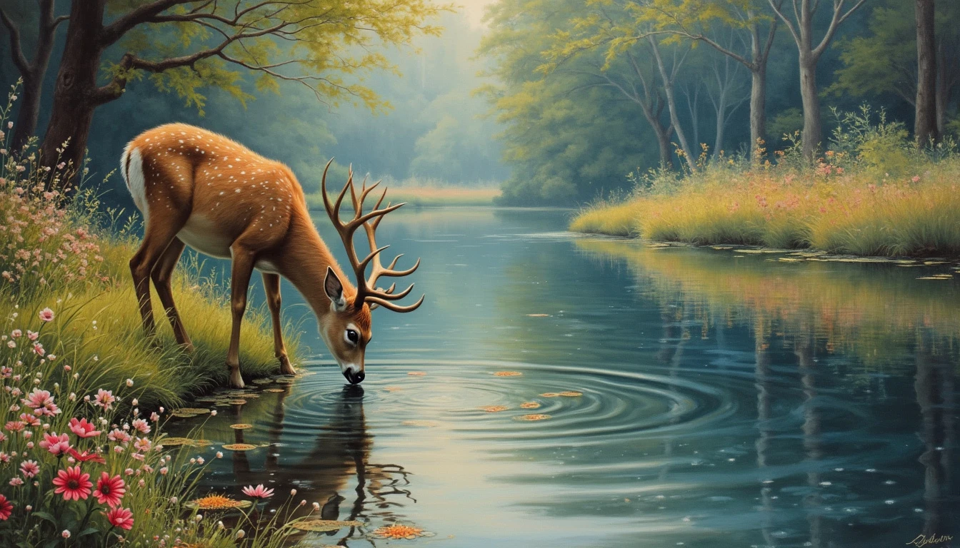 A serene wildlife scene by a serene river, with a graceful deer taking a drink, its reflection mirrored in the calm water, surrounded by tall grasses and vibrant wildflowers, capturing the tranquility and serenity of the natural world, Drawing, graphite on paper, bokeh fantasy oil on canvas poster wallpaper Greg Rutkowski Thomas Kinkade Oil Painting Tim Burton Esao Andrews impasto style Silke Leffler Thomas Kinkade fantasy Orton-Effect