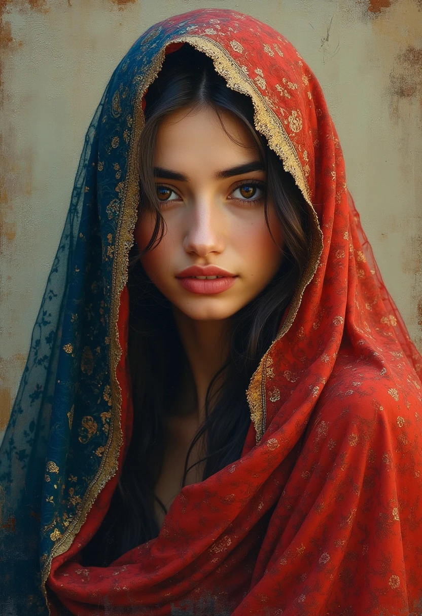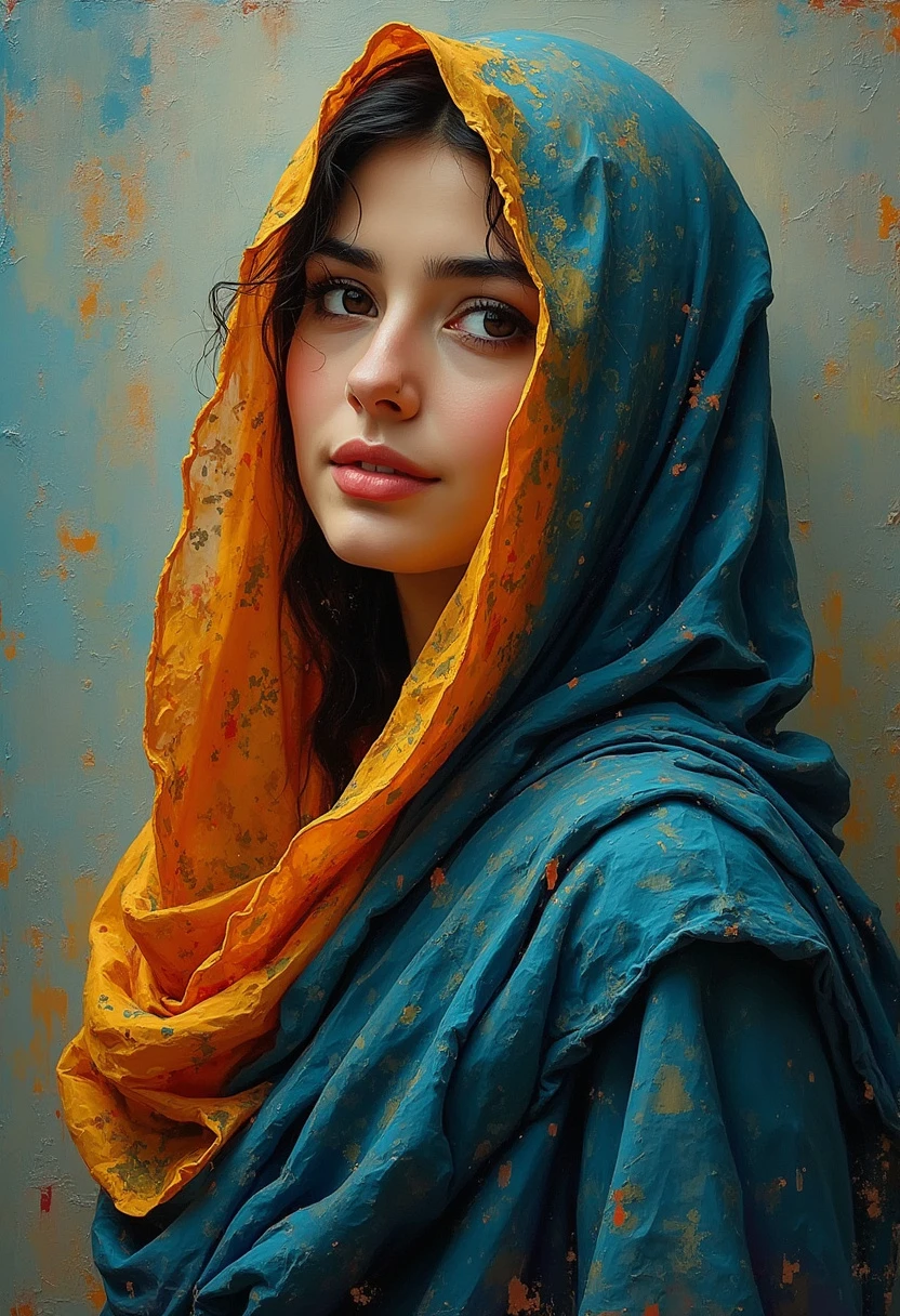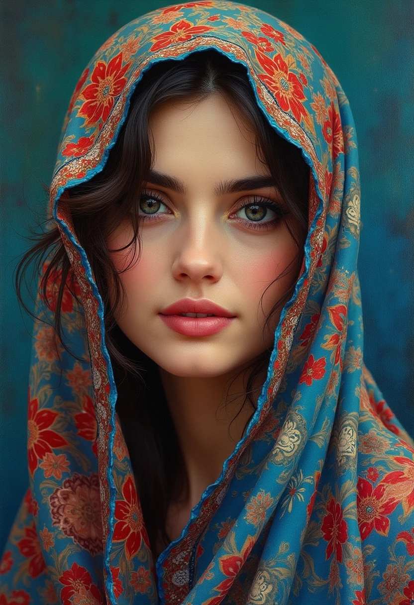 Half-length portrait of a Persian beautiful woman with veils covering her head, soft melancholic smile, vivid image of multiple layers, oil painting , vivid and saturated colors, hyper-detailed illustration, background textured, fluidity
