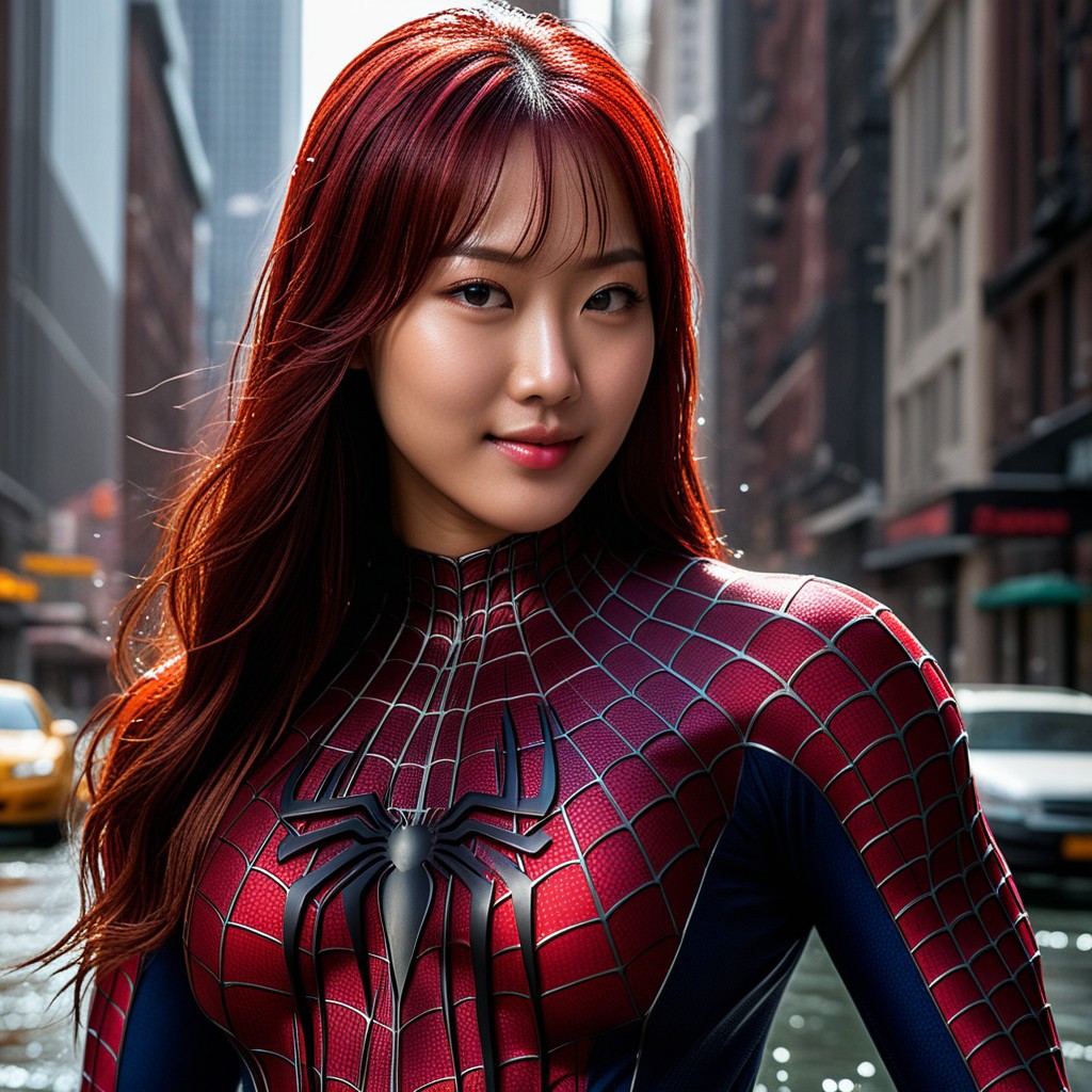 score_9, score_8_up, score_7_up, best quality, realistic, masterpiece, beautiful detail, hyperrealistic, ((1girl, woman body, big breasts)), amazing detailed full body of a beautiful korean mary jane, wearing a realistic and highly detailed black raimi spider-man suit, ((huge muscular girl)), amazing detailed full body portrait of a sexy korean girl, wearing a realistic and highly detailed raimi spider-man suit, ((huge muscular girl)), professional model wears ultra - detailed raimi spider - man suit, ultra - detailed and grained raimi spiderman suit, suit covered entire body and hand, black spiderman gloves, wet,, wet, (close up selfie pose, smile), close up, octane render, highly detailed, volumetric, dramatic lighting, (highest quality:1.1), (HDR:1.3), (top quality, best quality), realistic, high definition,