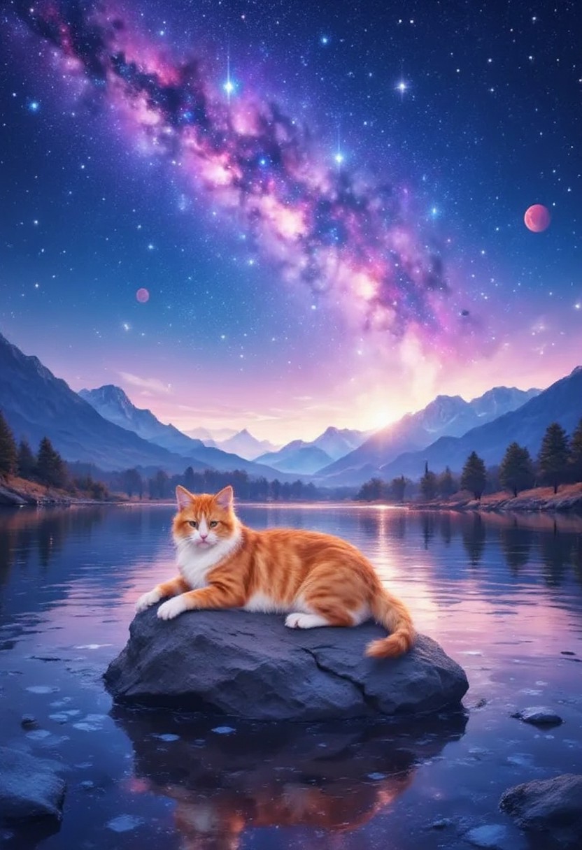 mlkwglx, galaxy, stars, This is a highly detailed, digital artwork featuring a serene, orange tabby cute cat with white fur and dark stripes, lounging on a large, smooth, gray rock that floats in a serene, reflective pool. The cat is positioned in the center of the image, lying down with its front paws tucked under its chest and its tail curled around its body, giving a relaxed and contented appearance. The cat’s eyes are a bright yellow, and its expression is calm and composed. The background is a vibrant, cosmic scene with a deep blue sky filled with countless stars and nebulae. The sky transitions into a swirling, colorful aurora-like band of purples, pinks, and blues, adding a sense of awe and wonder. In the distance, there are towering, snow-capped mountains that fade into the horizon, and a line of dark green trees frames the edge of the pool, enhancing the natural setting. Two planets, one red and one blue, are visible in the sky, adding to the otherworldly feel of the scene. The reflection of the cat in the water is perfectly mirrored, adding a sense of symmetry and depth to the image. The overall style is highly detailed and realistic, with a focus on textures and light to create a lifelike