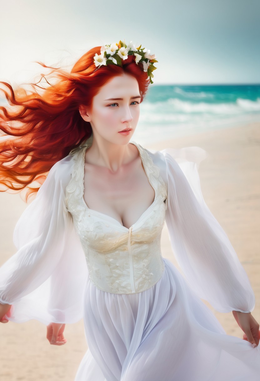 a woman in a white dress with flowers in her hair, wind kissed picture, wind kissed pictures, photo of a woman, windblown red hair, hair in wind, romance novel cover, windblown, ((30 years old woman from Cuba)), princess Ariel, womans face looking off camera, hana yata, breathtaking flower tiara, windy beach, wind in hair