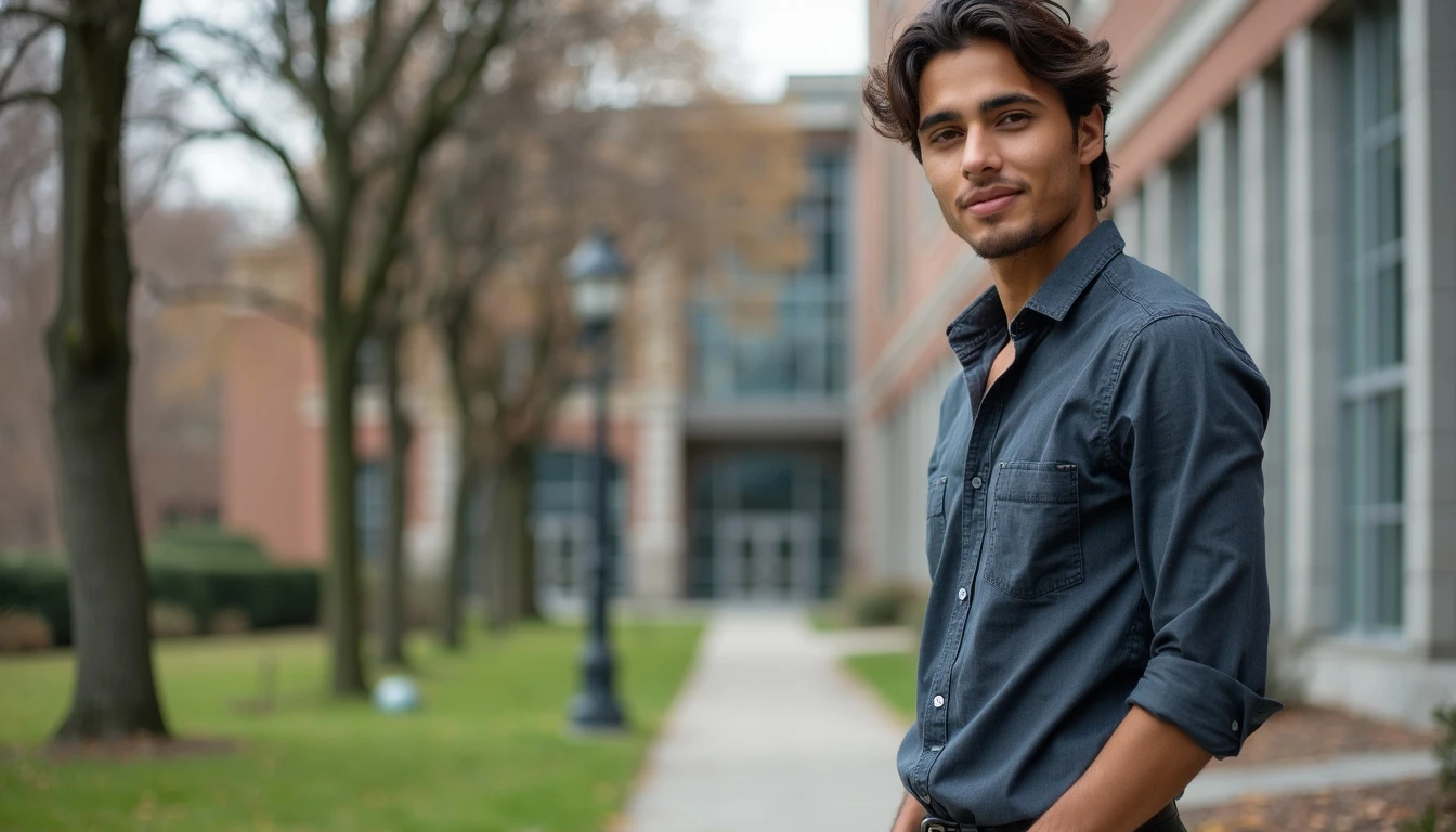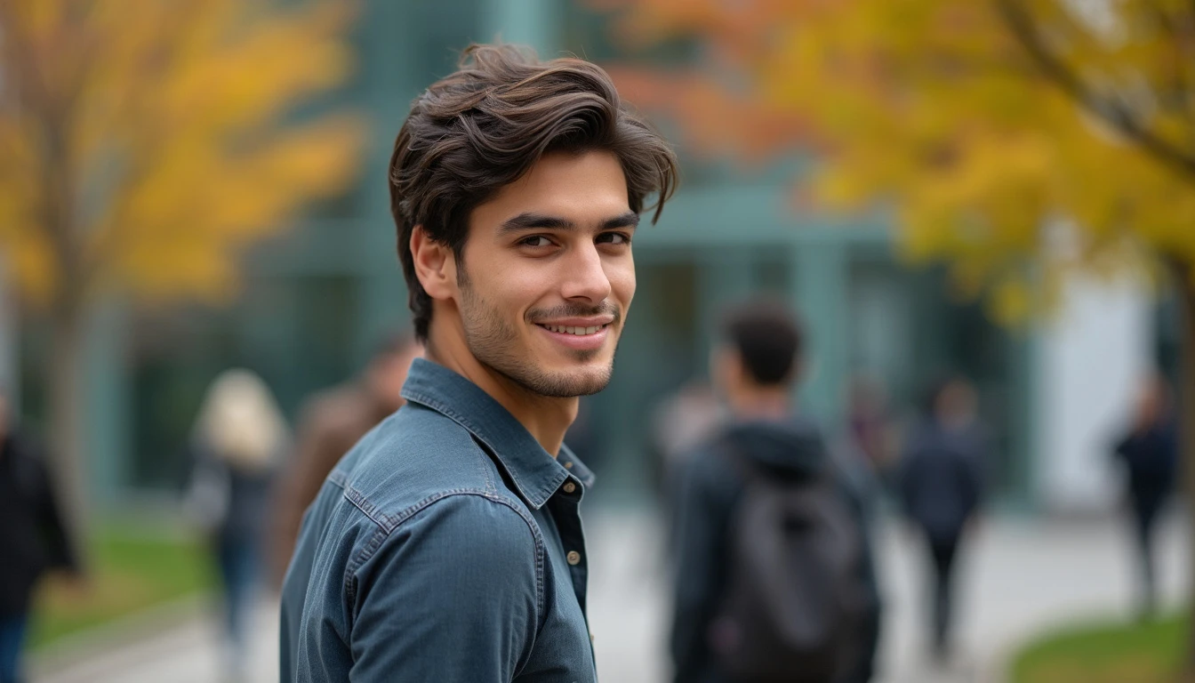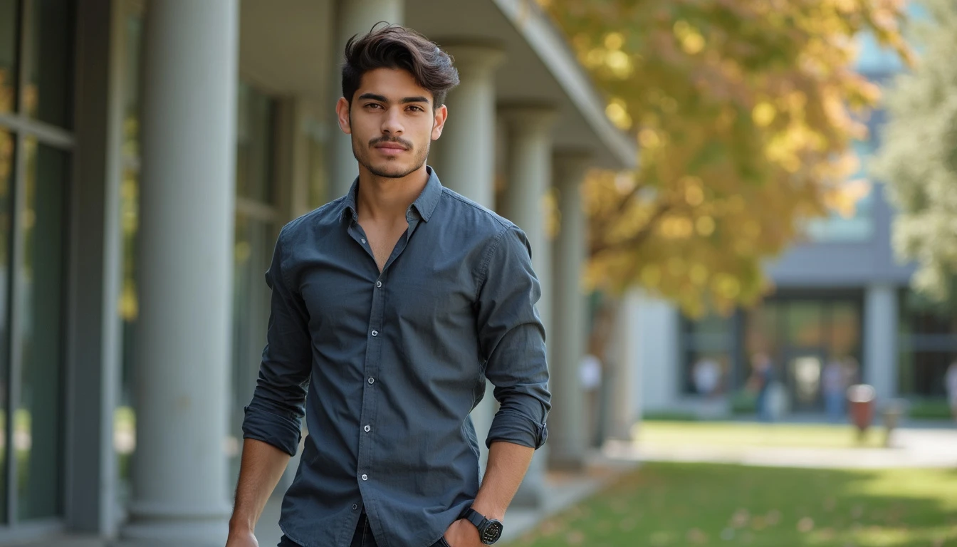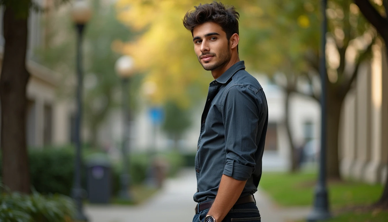 Side view photo of a handsome 26-year-old Brazilian man, captured in a natural setting on a Canadian university campus. The man is approximately 6 feet tall, with a lean, athletic build. He has short, wavy, slightly tousled dark brown hair and warm brown eyes that exude kindness and confidence. His skin tone is a light tan, reflecting his Latin American heritage. Attire: A fitted dark blue or gray dress shirt with rolled-up sleeves, paired with dark jeans. He is wearing simple, comfortable sneakers and has a watch on his left wrist. The focus is on the man.