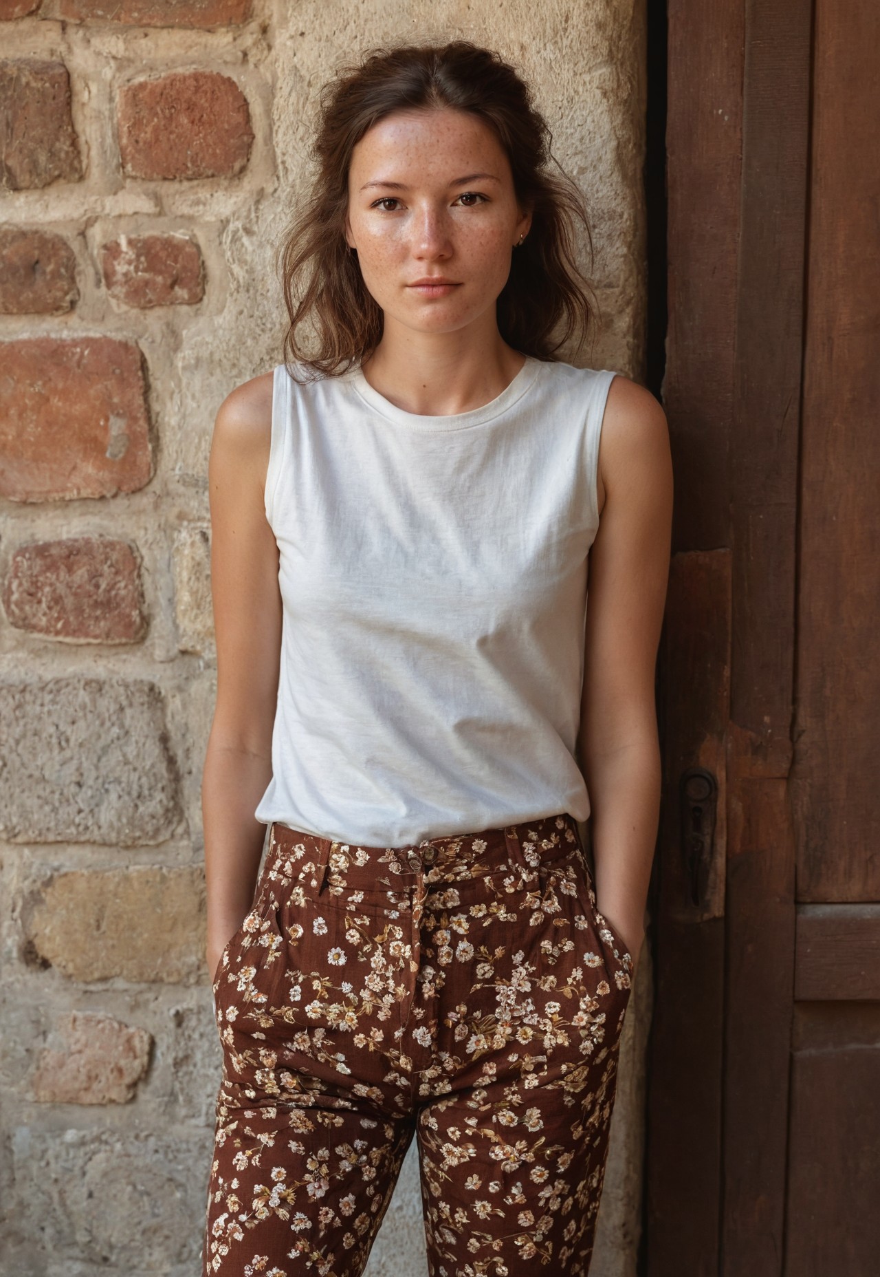 safe_pos, An beautiful 35mm photo of a 30 year old Dutch woman, ((sleeveless t-shirt)), ((flower print cotton pants)), ((full body:1.2)),she has a comely face, pale skin, very dark eyes, chocolate brown hair, straight hair, 70's fringe, ponytail, beautiful mouth, long face, narrow chin, freckles on nose, birthmarks on stomach, she is slim, natural tits, perfectly shaped tits, pubic hair, ultra realistic, extremely detailed, highly detailed eyes, realistic eyes, highly detailed skin, realistic skin, happy, in the Chianti area in Tuscany, evening, soft natural light, Rembrandt style light, 8k resolution, masterpiece, 35mm, Hasselblad, film grain, (ultra high res:1.2),(photo-realistic:1.3) (skin pores:1.1)