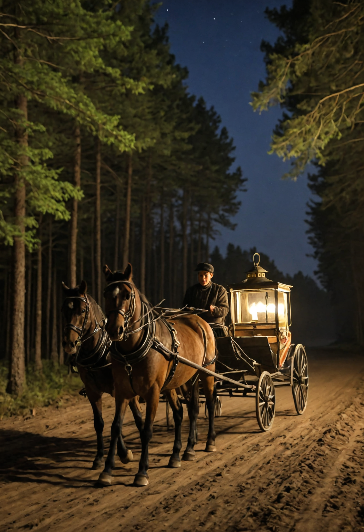 ((two horses)) carriage on a dirt road, driver holding a small lantern, forest, (night, dark), side view