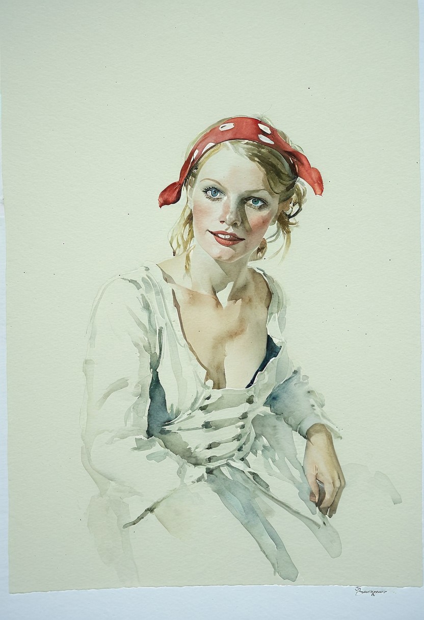 Facial expression style, (watercolor:1.3), (Gil Elvgren:1.1), ((clever pirate)) British female (cute:1.4), (sagging empty breasts:0.7), (Andrew Wyeth:0.4)