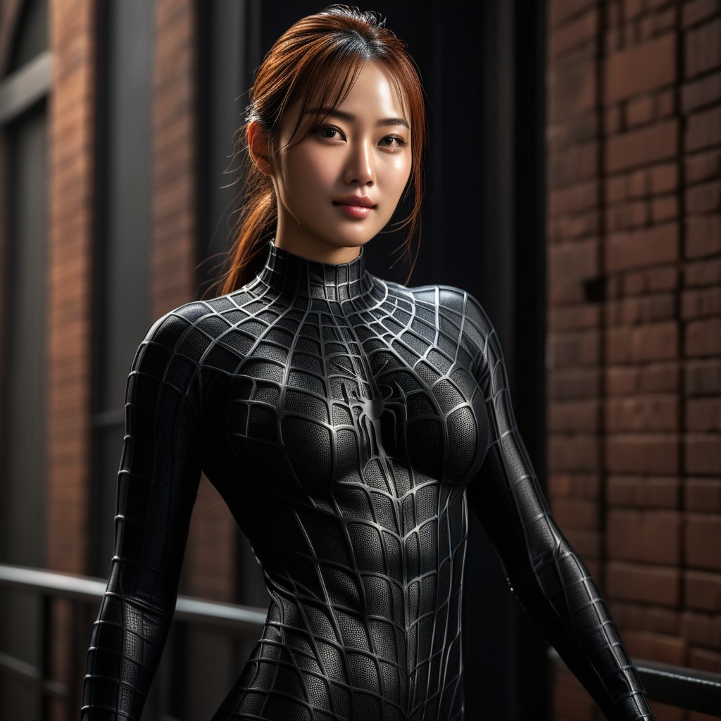 score_9, score_8_up, score_7_up, best quality, realistic, masterpiece, beautiful detail, hyperrealistic, night, ((1girl, woman body, large breast)), amazing detailed full body of a cute korean girl, wearing a realistic and highly detailed black raimi spider-man suit, ((defined muscular girl)), professional model wears ultra - detailed black raimi spider - man suit, ultra - detailed and grained black raimi spiderman suit, suit covered entire body and hand, black spiderman gloves, wet, (light smile), close up, octane render, highly detailed, volumetric, dramatic lighting, (highest quality:1.1), (HDR:1.3), (top quality, best quality), realistic, high definition, sharp contrast between light and shadow, athletic and fit physique, highly detailed and accurate portrayal, photorealistic rendering, tense and alert atmosphere cinematic scene, cinematic lighting, intricate detail skin and facial texture, lifelike expression, accurate character design, interesting and complex background details,