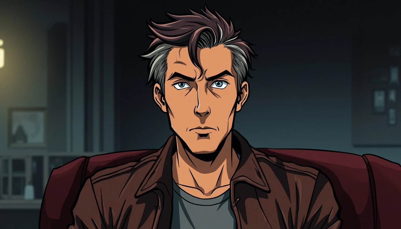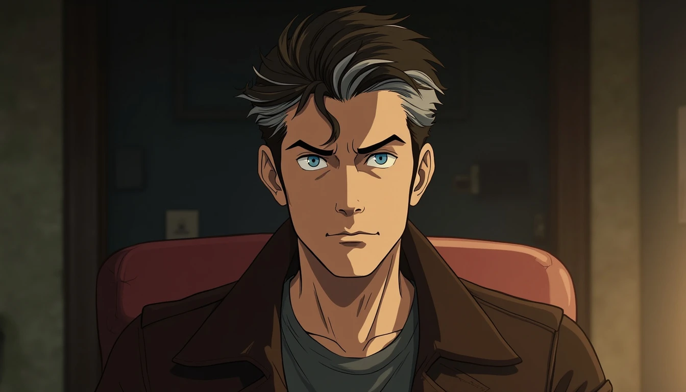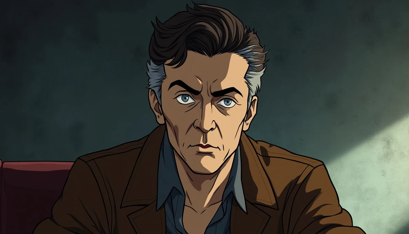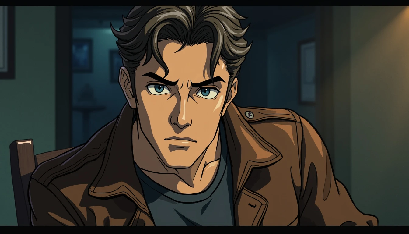Medium close-up shot, Film grain, vintage aesthetic, high-contrast shadows, cinematic lighting, atmospheric haze, Jack Harrison, a male with lightly tanned weathered skin, angular facial structure, slightly hooked nose, thin lips, short slicked-back dark brown hair with gray streaks, piercing blue eyes. Wearing a dark brown leather jacket, gray shirt, intense expression, seated in a dimly lit room.