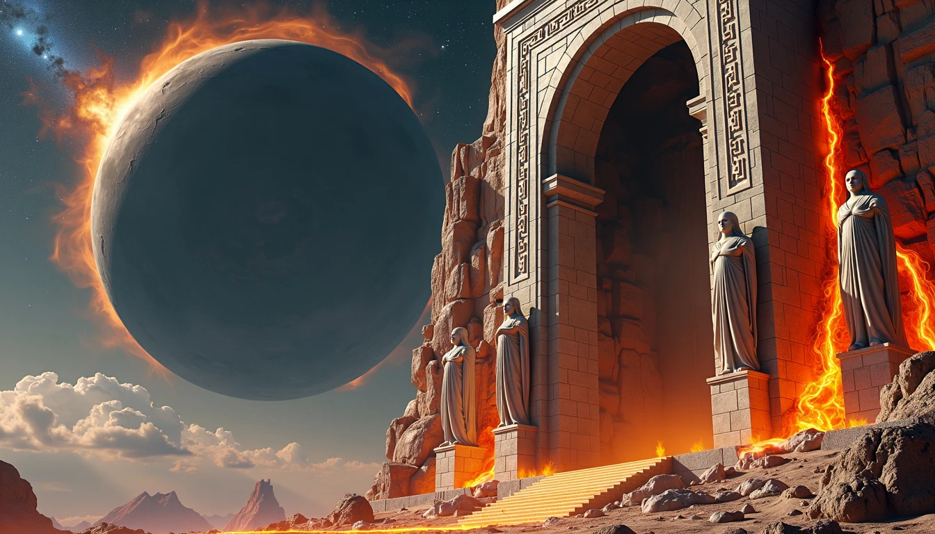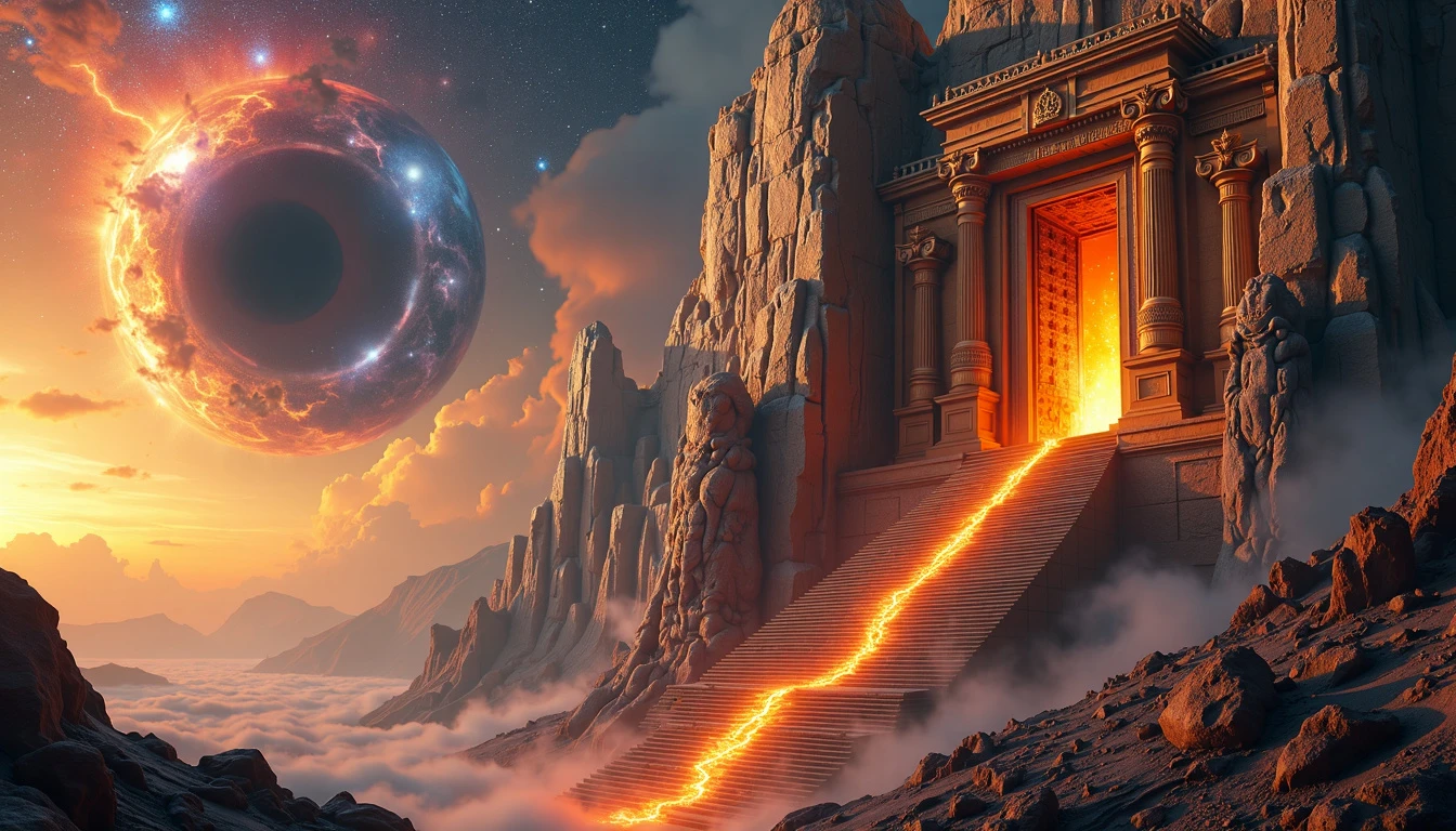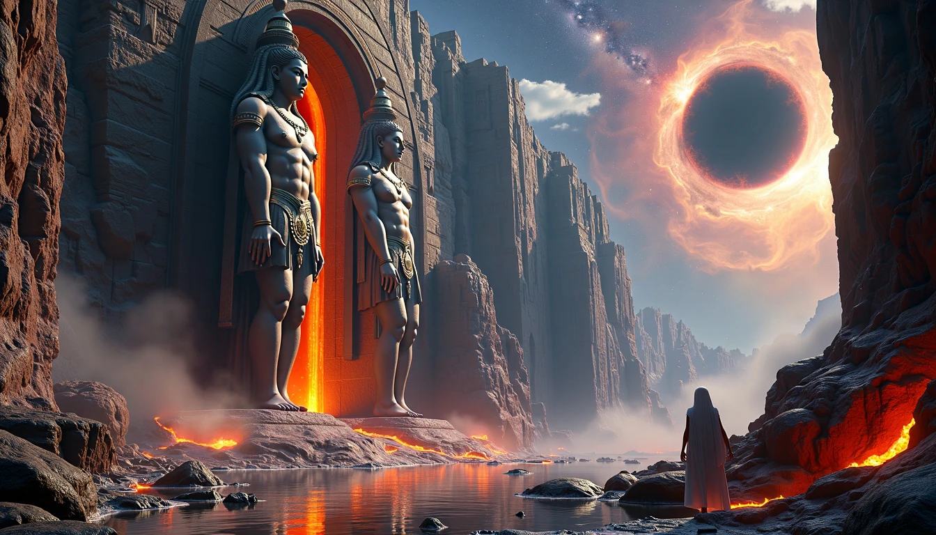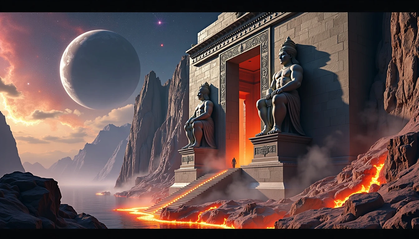 Photorealistic view of a colossal temple carved into the side of a towering cliff, with gigantic godly figures made of stone and metal emerging from the rock, holding up the temple with their immense strength, rivers of molten lava flowing down the cliffside, night sky with nebulae, supermassive black hole in the sky. Deep depth of field.