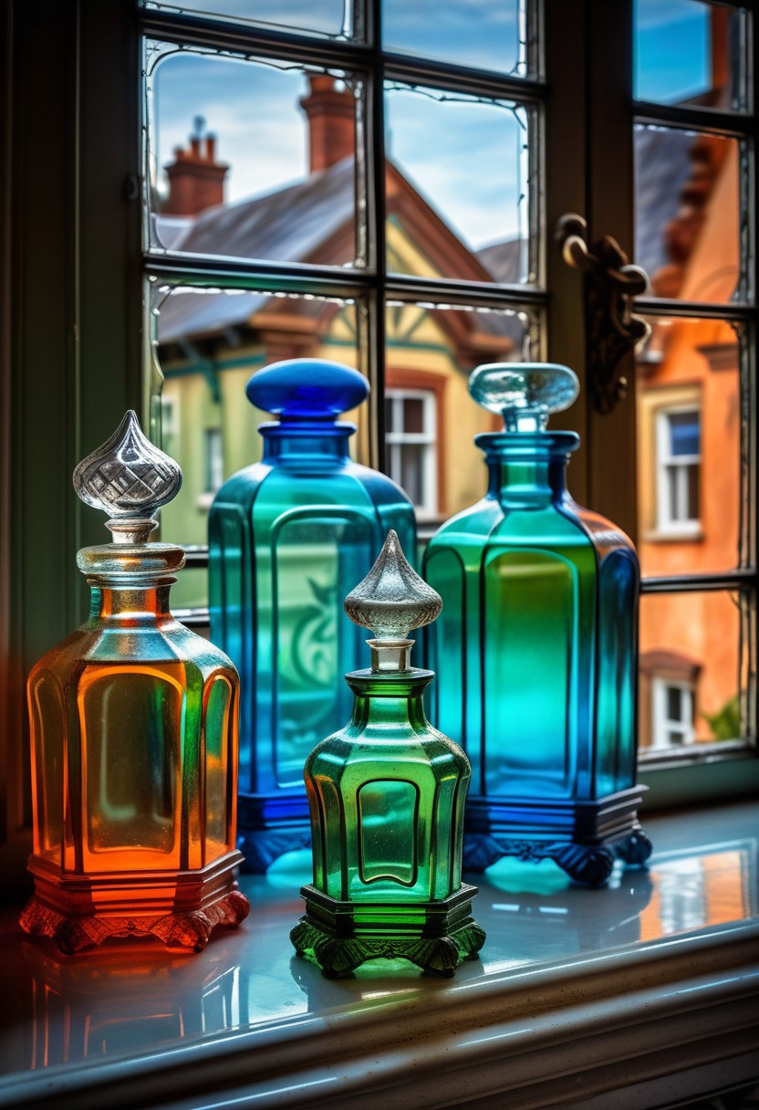 Classic photography, sculpture in Art Noveau style, realistic, photografic, perfume glass collection, right angles, translucent, blue, green and orange, vibrant colors, classic labels, detailled, in a vintage bathroom, near a window, in a old victorian house, perfect composition, perfect geometry, masterpiece