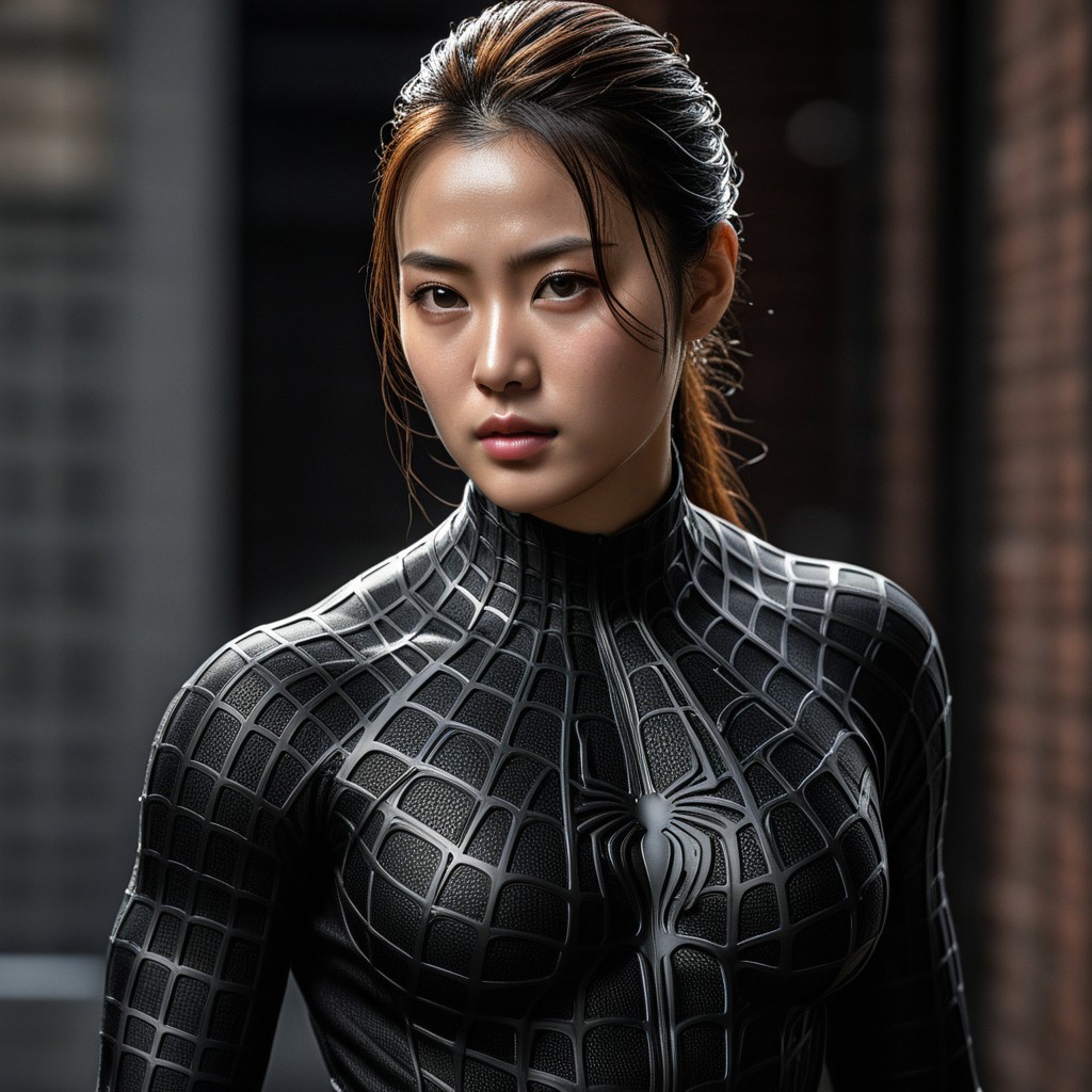 score_9, score_8_up, score_7_up, best quality, realistic, masterpiece, beautiful detail, hyperrealistic, night, ((1girl, woman body, large breast)), amazing detailed full body of a beautiful korean girl, wearing a realistic and highly detailed black raimi spider-man suit, ((defined muscular girl)), professional model wears ultra - detailed black raimi spider - man suit, ultra - detailed and grained black raimi spiderman suit, suit covered entire body and hand, black spiderman gloves, wet, (dirty skin), close up, octane render, highly detailed, volumetric, dramatic lighting, (highest quality:1.1), (HDR:1.3), (top quality, best quality), realistic, high definition, sharp contrast between light and shadow, athletic and fit physique, highly detailed and accurate portrayal, photorealistic rendering, tense and alert atmosphere cinematic scene, cinematic lighting, intricate detail skin and facial texture, lifelike expression, accurate character design, ((full body, sitting pose), interesting and complex background details,