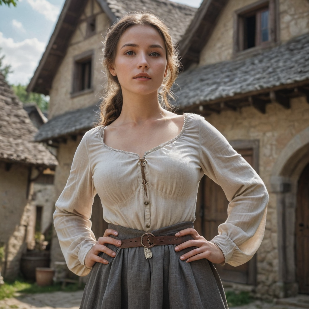 centered, wide shot photo, from below, beautiful woman peasant, perfect breasts, round breasts, medieval tunic, fantasy village