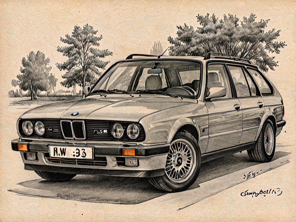 vintage pencil drawing, masterpiece, car, BMW E30 Touring