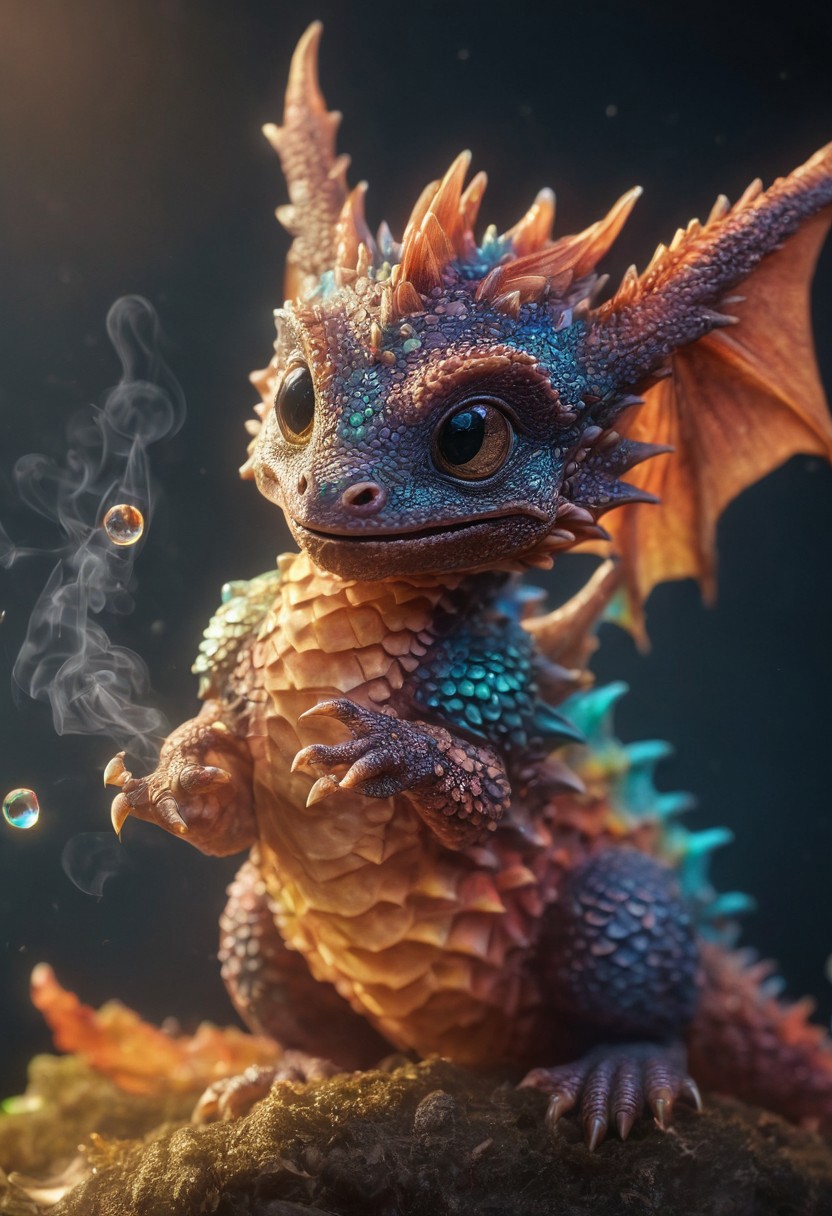 16k, photorealistic, ultra sharp, ultra detail, ultra intricate ultra cute baby dragon , magic spells, innocent, fantasy, refraction, smoke, ray tracing, vibrant colors, cinematic,